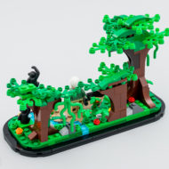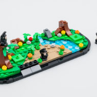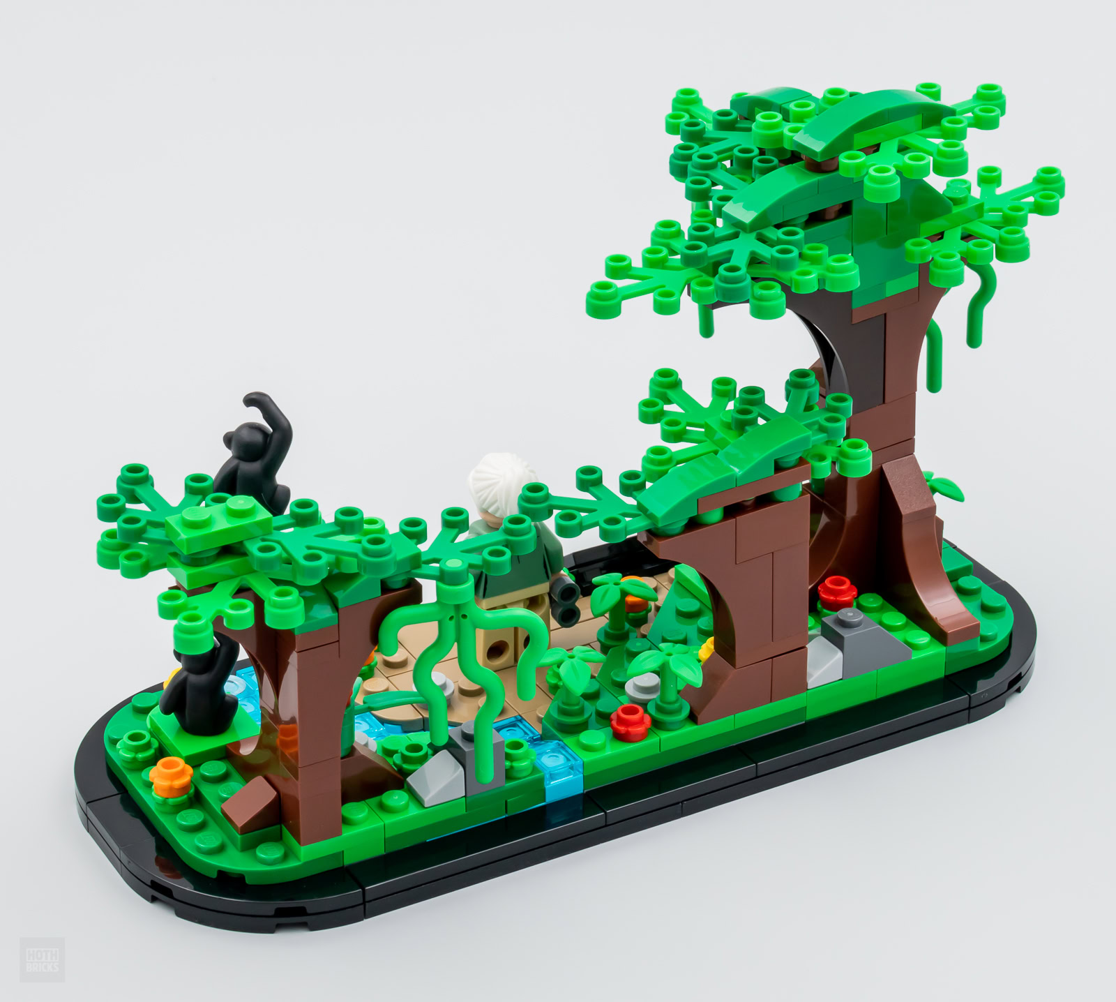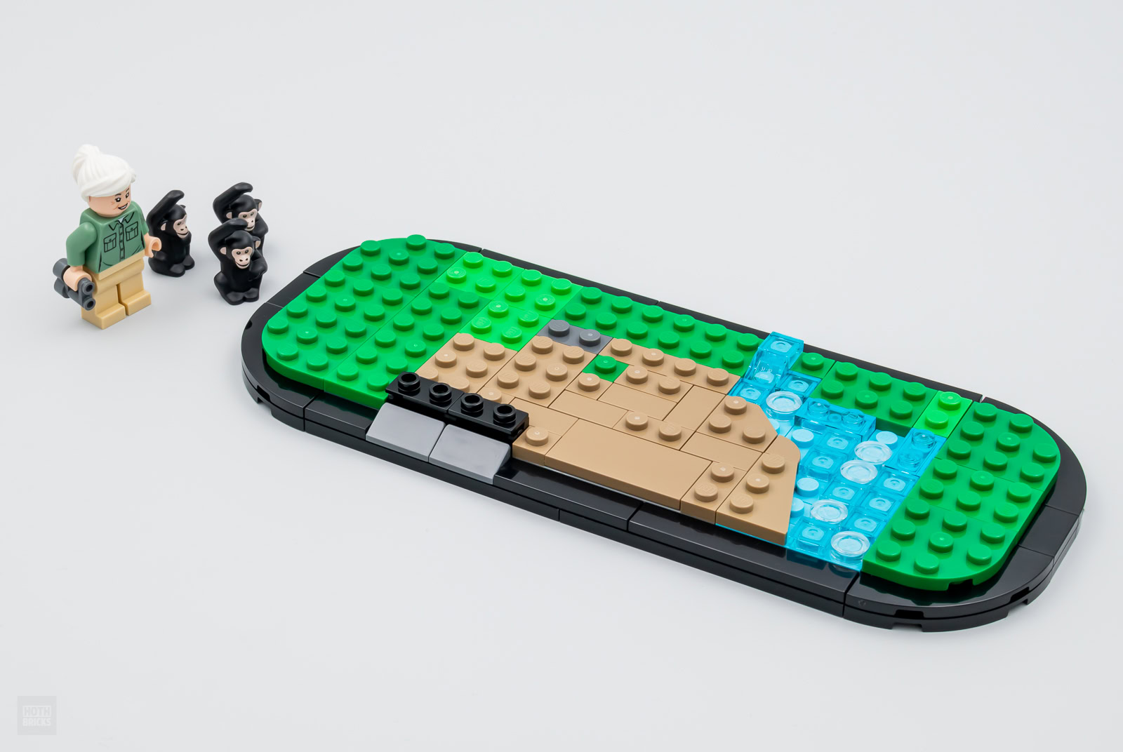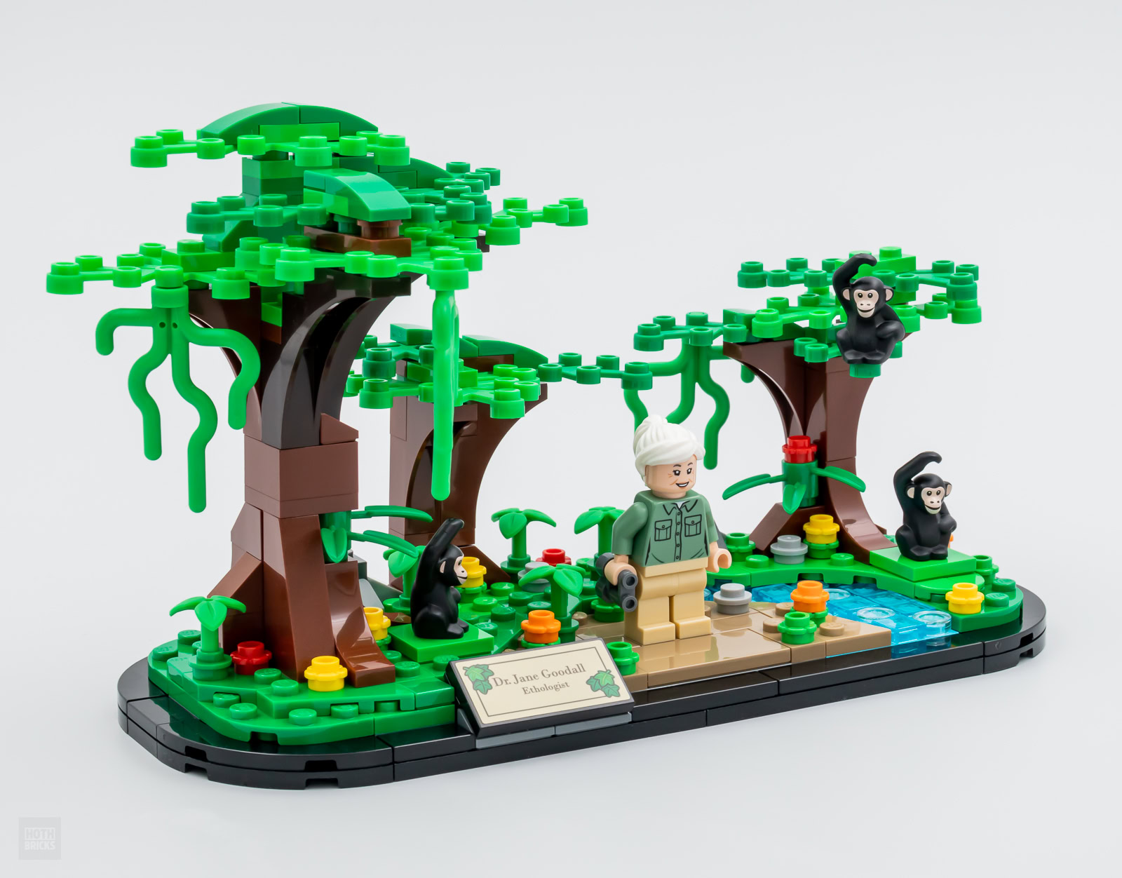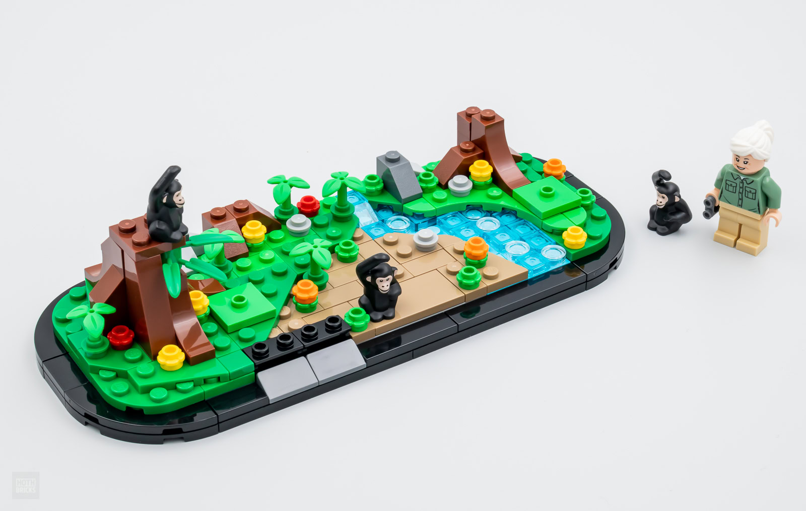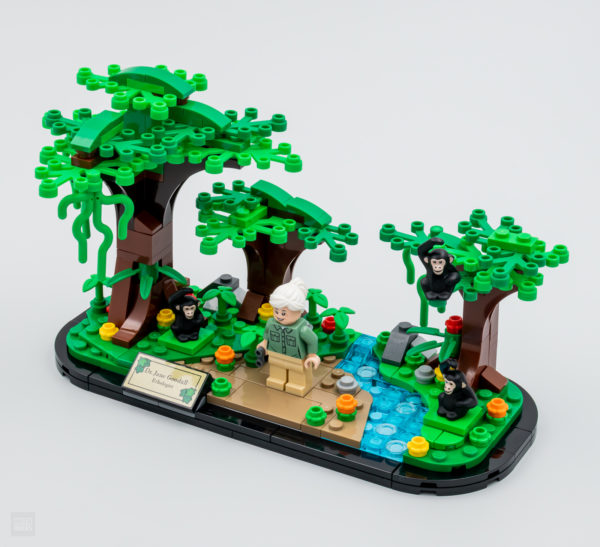 Le reste du set ne sert qu'à mettre en valeur la minifig et les trois chimpanzés fournis, il s'agit d'assembler un socle aux courbes similaires à celles du set 40450 Amelia Earhart Tribute offert chez LEGO l'an dernier à la même époque et de meubler ensuite le support avec quelques arbres, un peu de végétation et un bout de ruisseau. Une petite plaque avec un sticker confirmant l'identité et la qualification de la figurine fournie prend place à l'avant du mini diorama. C'est bien réalisé sans être révolutionnaire, l'objet pourra trôner sur une étagère ou sur le coin d'un bureau sans prendre trop de place mais en se faisant remarquer.