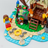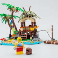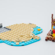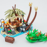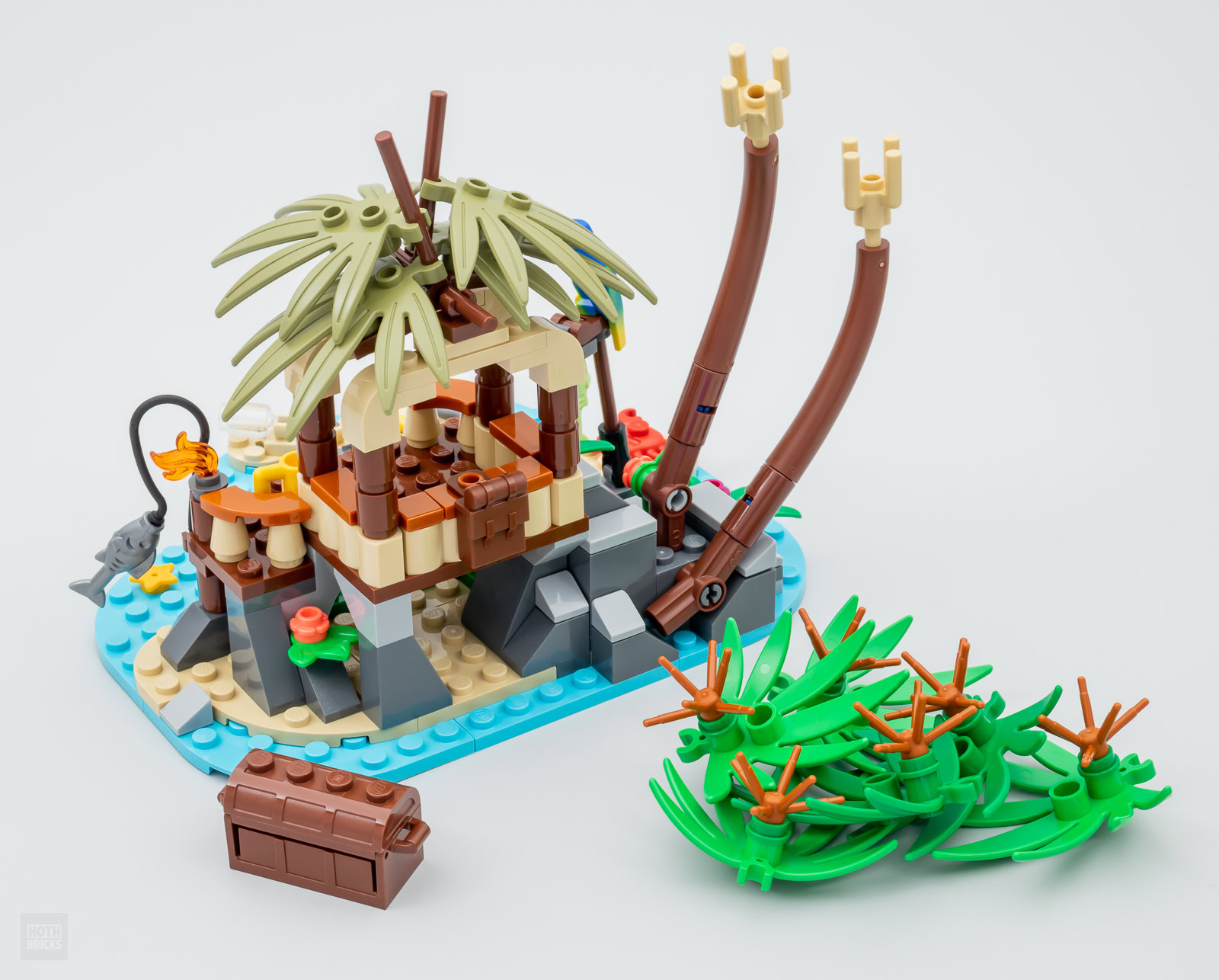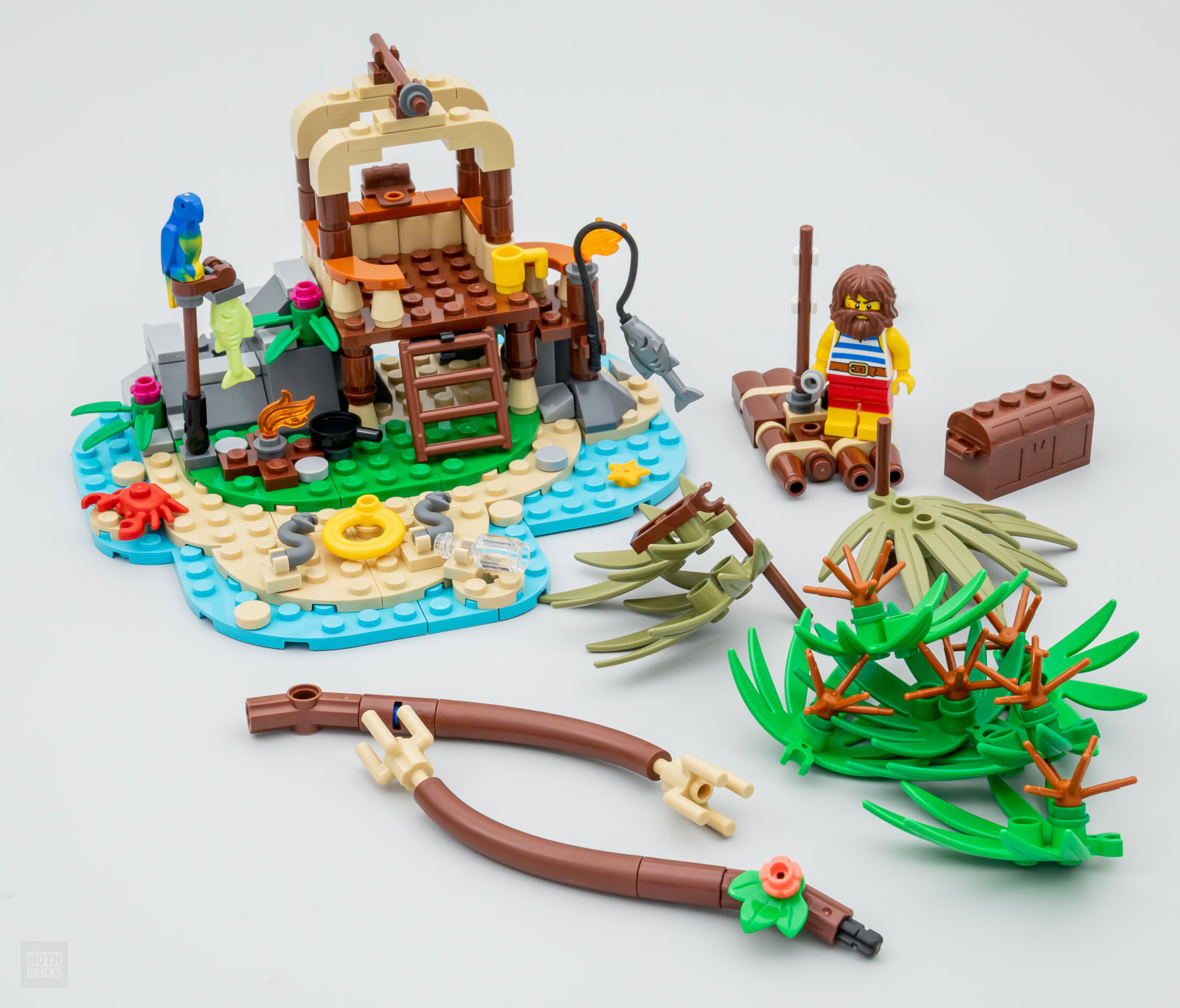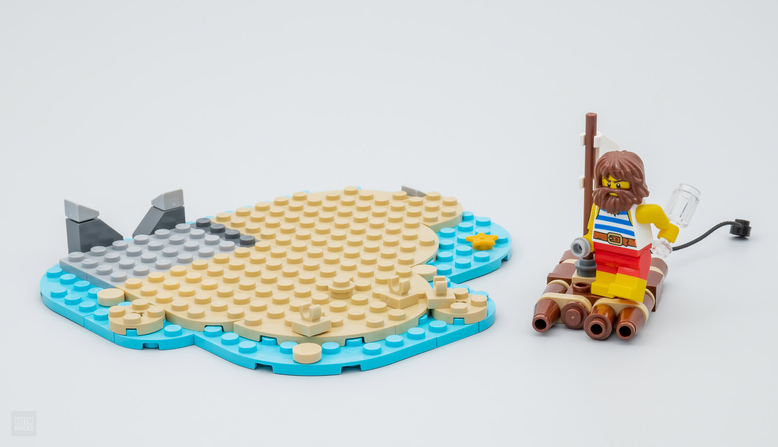 Le produit officiel n'est d'ailleurs pas seulement une jolie scène avec Ray le vacancier naufragé mais c'est également un pack plutôt riche en éléments divers et variés qui permettra aux plus créatifs d'étoffer un peu leurs dioramas. La végétation y est relativement abondante, on dispose de quelques plaques bleues et beiges, d'un coffre, d'une bouteille, de deux poissons, d'un crabe, d'un perroquet en deux couleurs, de deux serpents, d'une bouée et de quoi construire une petite hutte. C'est plutôt pas mal pour un petit set promotionnel de 239 pièces.