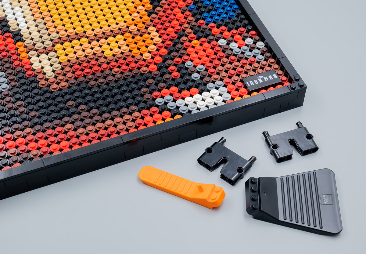 Il faut donc ensuite passer quelques heures à aligner des pièces, regrouper les 9 plaques entre elles via des pins et construire le cadre qui vient entourer et rigidifier la mosaïque. On fixe les deux crochets qui permettent de plaquer la chose au mur et c'est réglé. Si vous n'avez pas l'intention de fixer Iron Man au mur, il faudra vous débrouiller : LEGO ne fournit ni pied ni chevalet à construire pour par exemple poser le tableau sur un meuble.