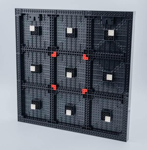 LEGO indique qu'il faut aussi installer neuf pièces blanches au centre du dos de chacun des modules qui composent le tableau, je les ai volontairement excentrées pour ne pas forcer sur le centre de l'excroissance prévue pour ça qui me semblait offrir plus de résistance que de coutume. J'ai compris plus tard pourquoi j'avais du mal à les insérer.