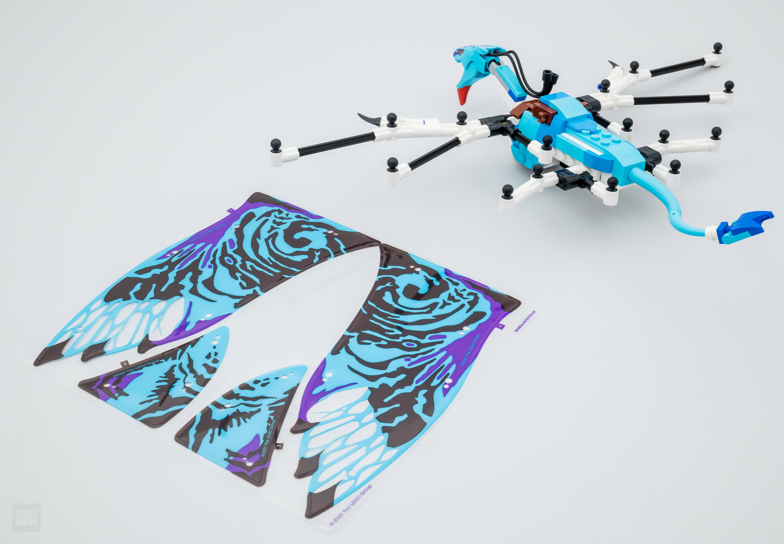 Concernant les ailes, le fabricant prend ici un raccourci qui décevra peut-être certains fans en les habillant avec de larges morceaux de plastique souple. Ces éléments sont joliment exécutés avec des impressions très colorées et un bel effet de transparence aux extrémités mais ils ne sont imprimés que d'un côté et sont bardés de la mention légale habituelle nous rappelant qu'il s'agit d'un produit LEGO. Ils sont comme d'habitude chez LEGO fixés via des pins noirs qui restent bien visibles en surface, l'effet n'est pas d'une finition exceptionnelle.
