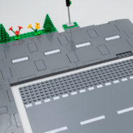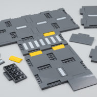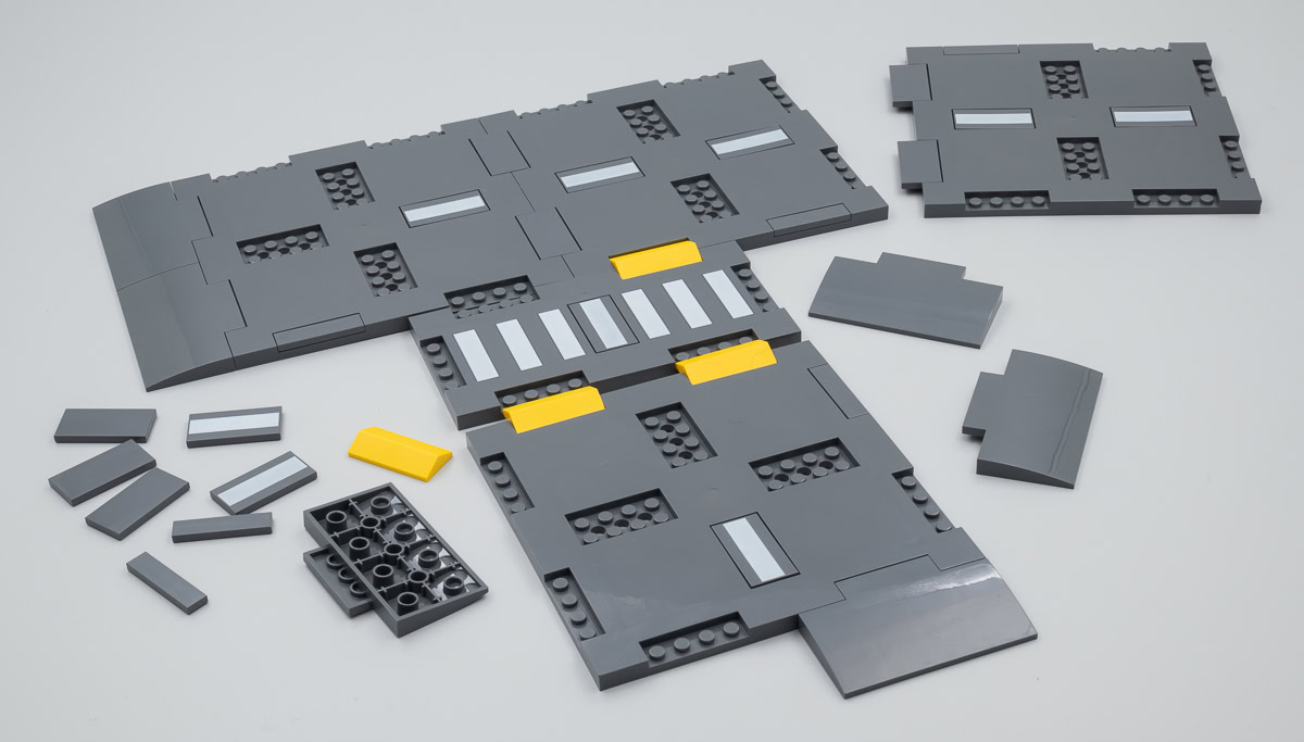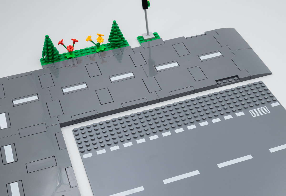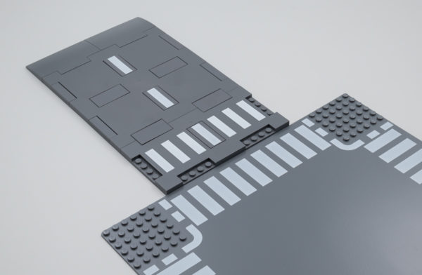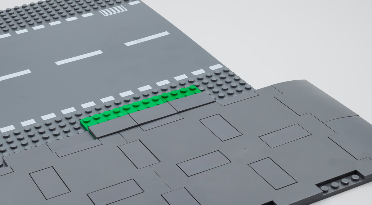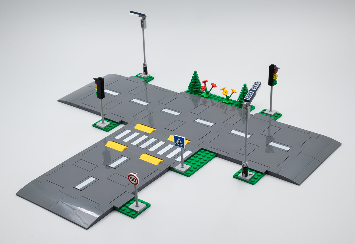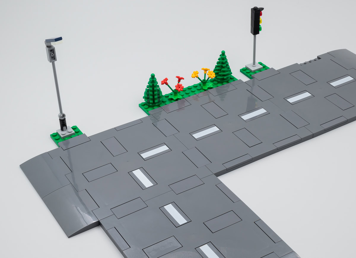 Ces modules peuvent être reliés entre eux via des tiles et LEGO a prévu une relative modularité qui autorise de nombreuses combinaisons. Des rampes permettent aux véhicules d'accéder à la route et le set 60304 Road Plates fournit de quoi assembler un gros croisement avec quatre modules 16x16 et un passage piéton en 8x16 bordé de ralentisseurs, le tout étant accompagné de quelques éléments de signalisation, de deux lampadaires et d'un peu de végétation. Il faudra débourser 19.99 € pour s'offrir ce set et multiplier la somme pour changer l'intégralité du revêtement des rues de vos dioramas.