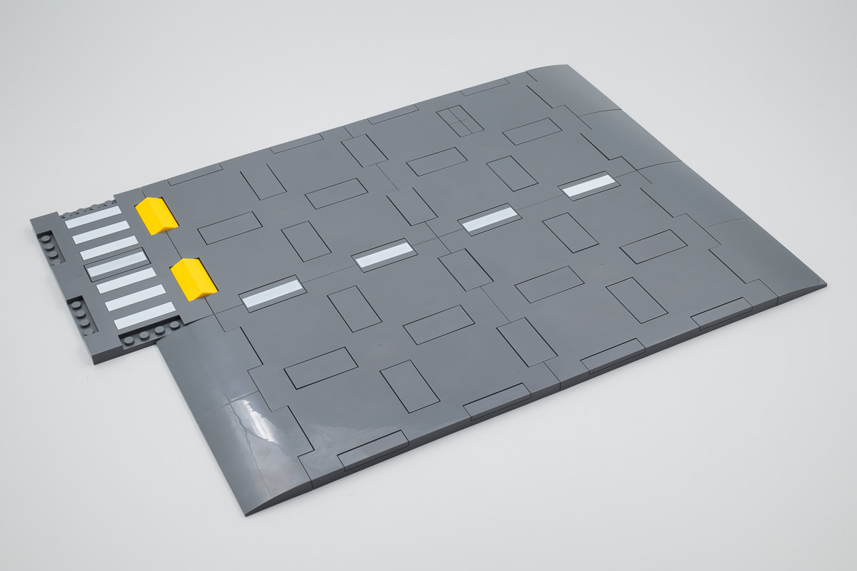 LEGO a choisi de proposer des éléments de chaussée lisses et brillants, j'aurais préféré un revêtement mat et un peu plus granuleux pour obtenir un véritable effet "route" et garantir une accroche minimale aux véhicules en circulation. La version proposée ne devrait pas résister très longtemps aux assauts des plus jeunes et cumuler rapidement les rayures.