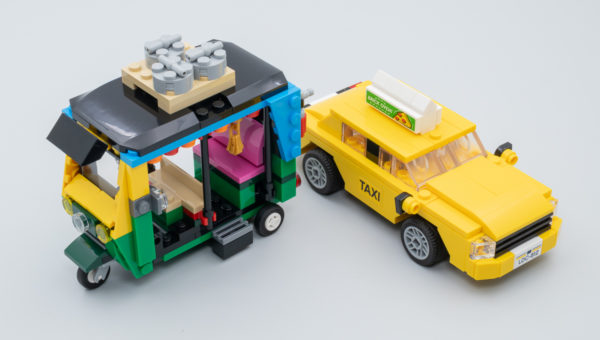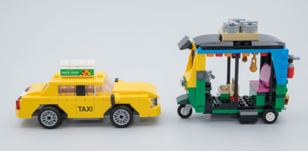 Avec leurs inventaires réduits, ces deux engins sont rapidement assemblés et ce sera ensuite à chacun de leur trouver une place dans un diorama : le taxi jaune pourra circuler dans les rues d'une ville LEGO "classique" et le tuk-tuk pourra éventuellement étoffer une étagère d'exposition thématique sur l'Asie (Ninjago, Monkie Kid), même si la version livrée ici n'est pas vraiment emblématique de la Chine ou du Japon et qu'elle n'est pas à l'échelle minifig.