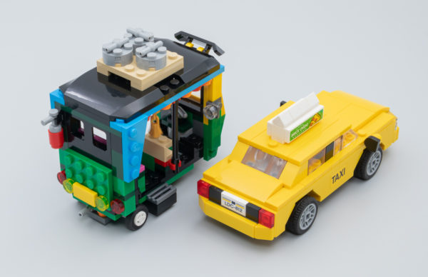 Le tuk-tuk de 155 pièces est beaucoup plus réussi, on y retrouve tous les attributs de l'engin qui circule dans les rues des mégapoles indiennes, pakistanaises ou thaïlandaises : panachage de couleurs plus ou moins assorties, décorations traditionnelles, paniers repas placés sur le toit, tout y est. L'assemblage de l'engin est plus intéressant que celui du taxi jaune, ce dernier n'étant finalement qu'une pile de briques sur roues. Si vous n'avez que 10 € à dépenser et qu'il vous faut choisir entre ces deux boites, c'est le tuk-tuk qu'il faut prendre, à la fois pour le résultat final et pour le plaisir d'assemblage.