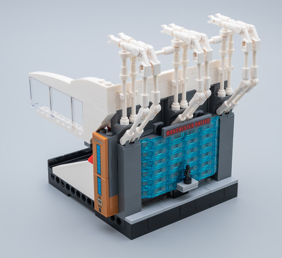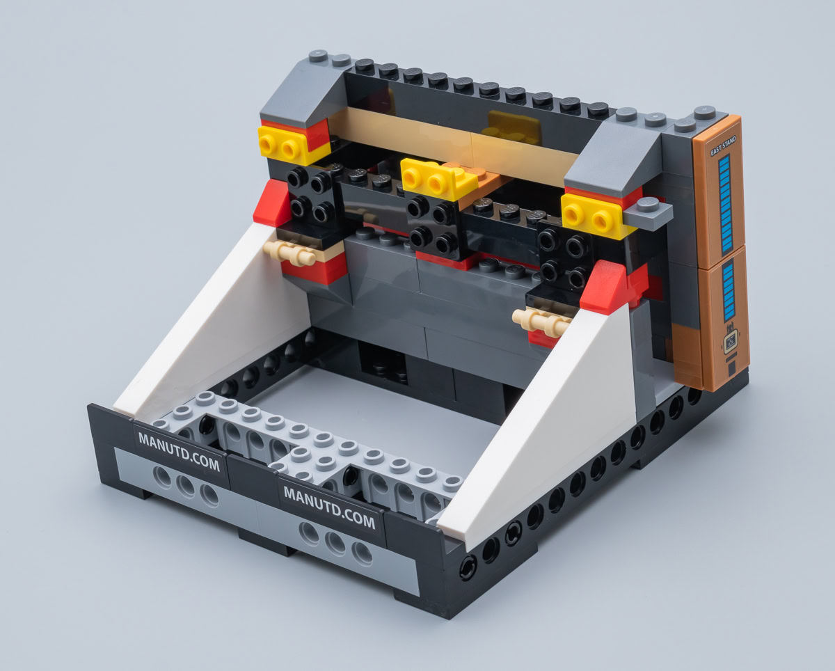 Bref, je sais que les fans de Manchester United et de LEGO se contenteront de cette rencontre entre deux univers qui les passionnent et seront volontiers indulgents avec les quelques détails de finition qui gâchent à mon avis un peu le produit, mais je reste persuadé que les tribunes méritaient mieux que cette grosse poignée de stickers mal assortis et ces finitions un peu approximatives. Je suis en revanche agréablement surpris par l'apparence extérieure des lieux et par la finition de la toiture de l'enceinte avec les différentes combinaisons de pièces qui incarnent les éléments de la structure métallique.