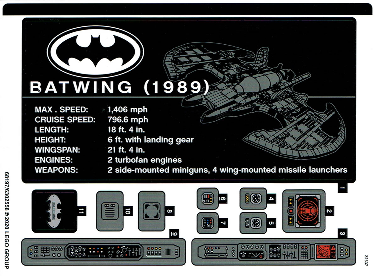 Ce n'est pas parce que ce produit est estampillé 18 + que LEGO se prive de nous imposer les habituels stickers avec quatre très petits autocollants qui viennent décorer le poste de pilotage. Les habitués de la gamme Speed Champions savent que ces minuscules stickers sont agaçants et pourront mettre ici en œuvre tout leur savoir-faire. On retrouve bien le joker sur l'écran principal du poste de pilotage et les ballons sur l'un des écrans latéraux, mais le modèle n'intègre pas la pince utilisée par Batman pour couper le câble et éloigner les ballons remplis de gaz Smylex.