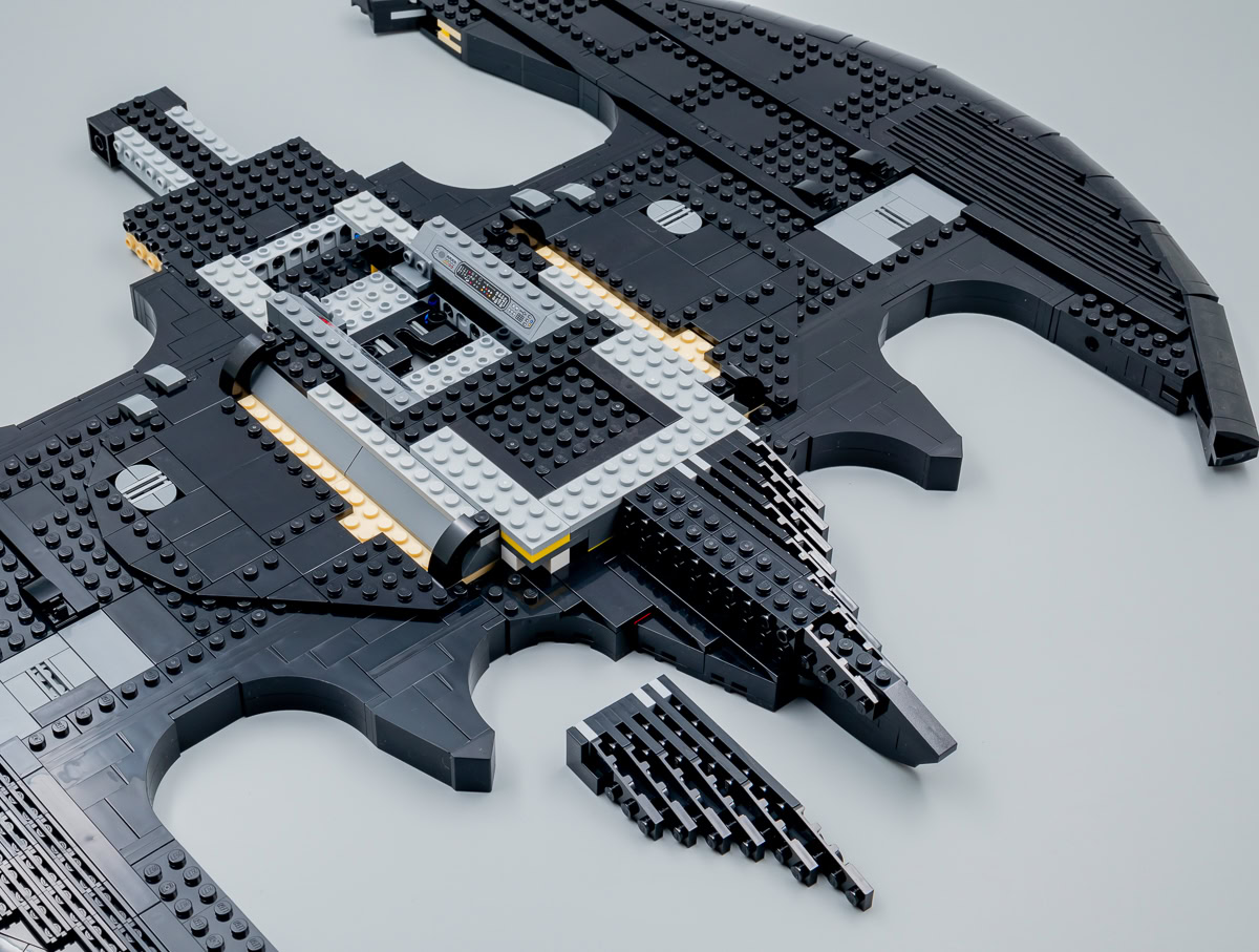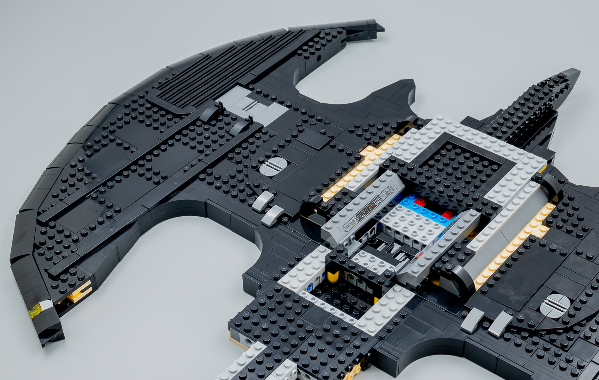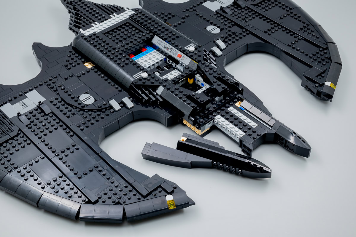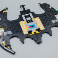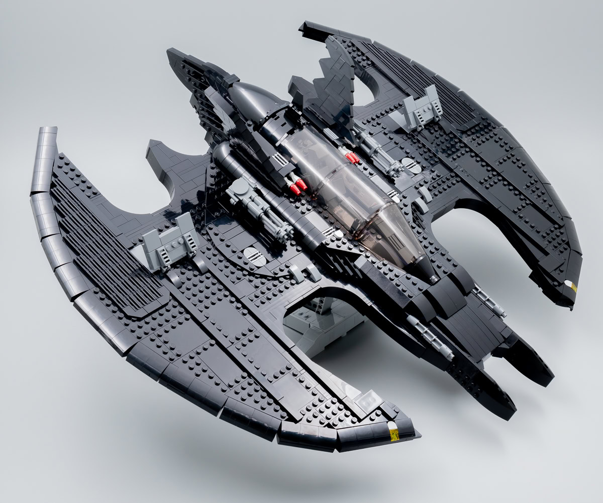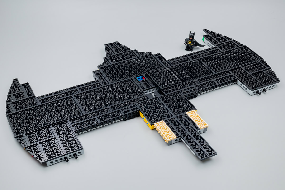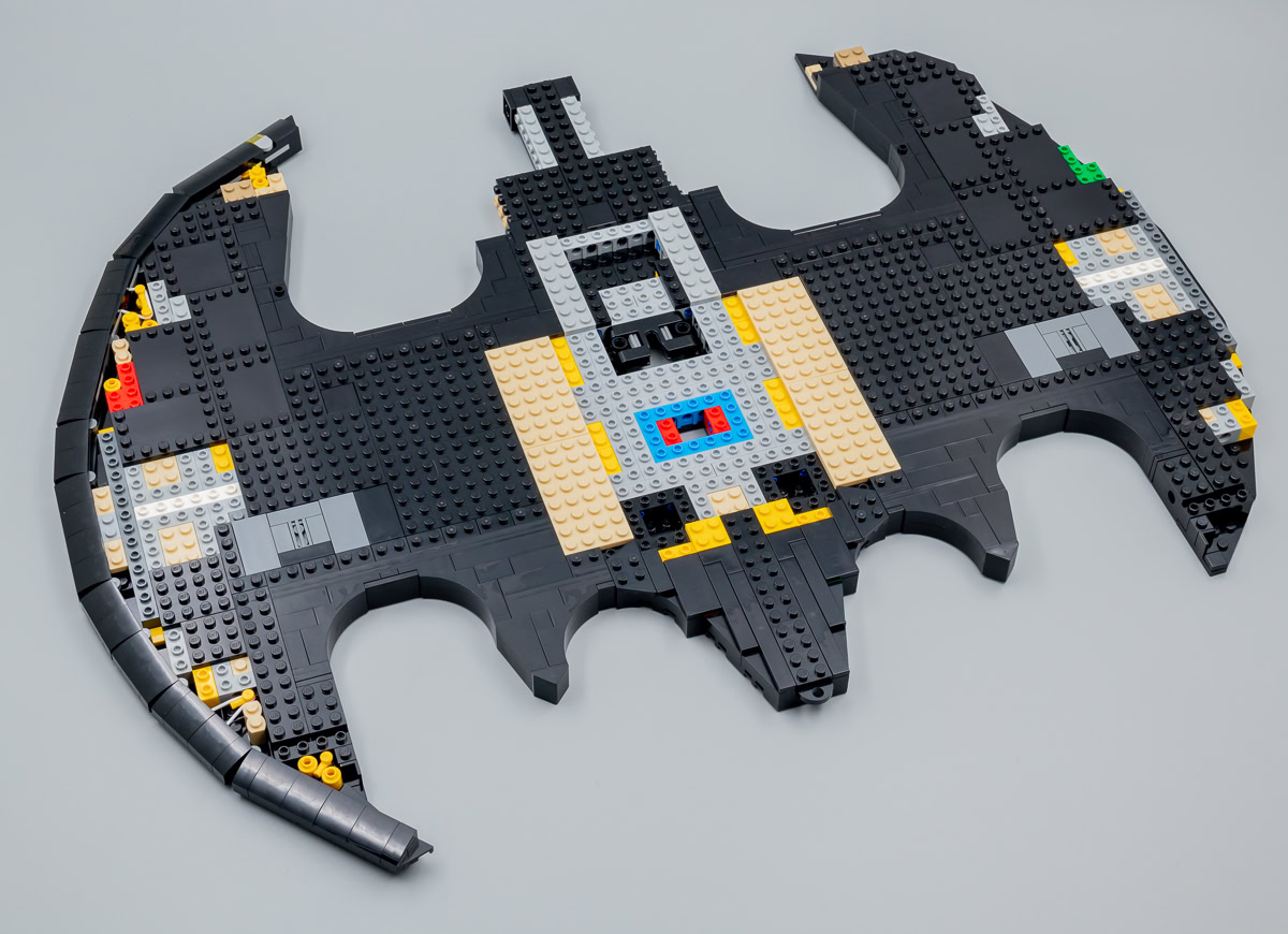 Autant le signaler tout de suite, j'ai pris un peu moins de plaisir à assembler ce Batwing que lors du montage de la Batmobile. Ici, on empile des plaques qui viennent recouvrir l'imposante structure interne basée sur des frames Technic, on construit quelques sous-ensembles en SNOT (Studs Not On Top) pour les excroissances dont la forme n'est pas définie par le châssis central, on reproduit des éléments à l'identique avec un effet miroir indispensable pour obtenir les ailes et il n'y a guère que le poste de pilotage et les différents éléments de décoration qui offrent un peu de variété. Mais la fin justifie les moyens et le résultat final est assez impressionnant avec un engin d'une envergure respectable : 58 cm de large, 52 cm de long.