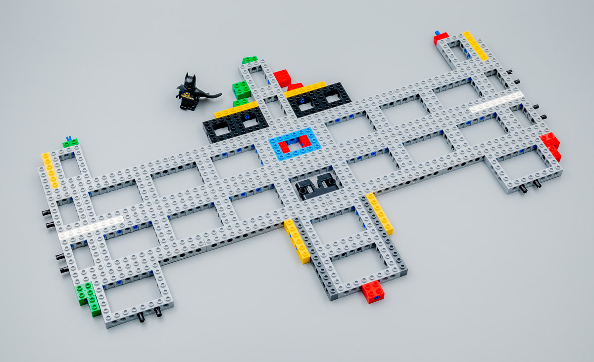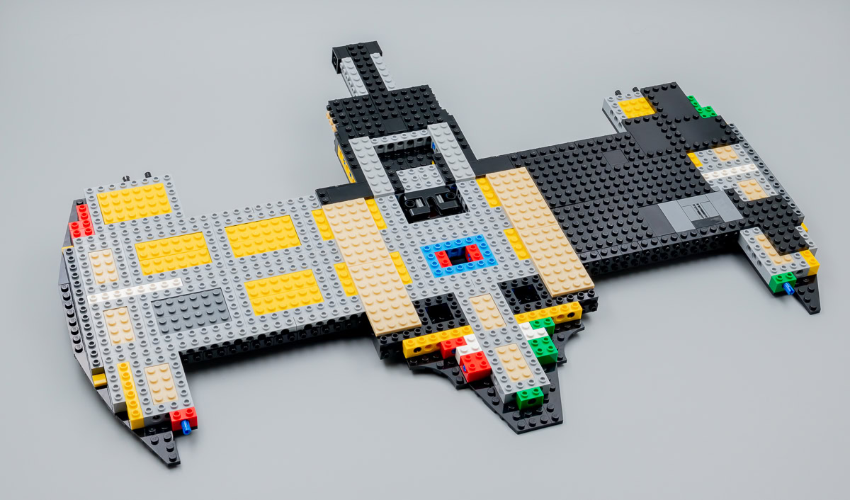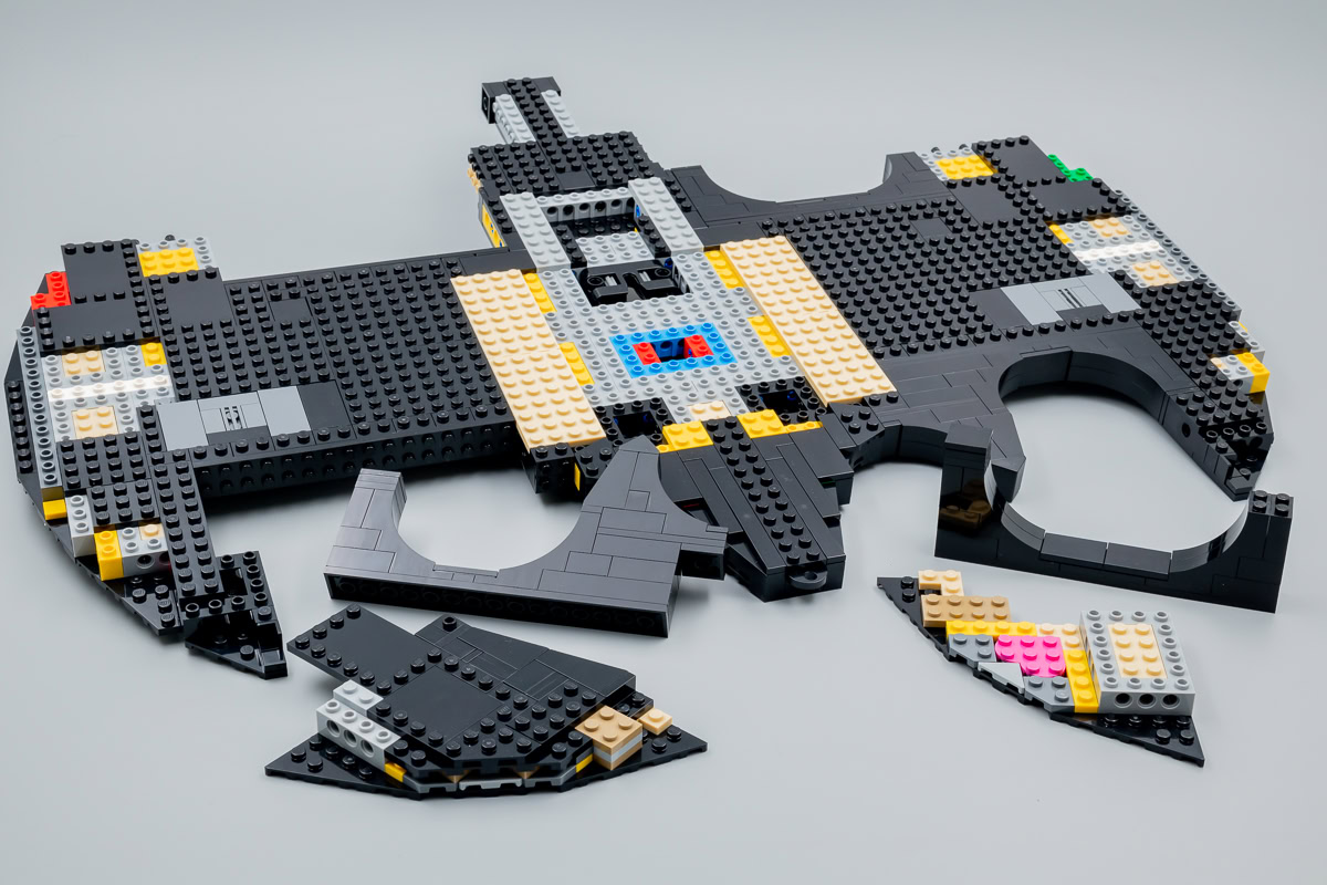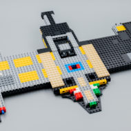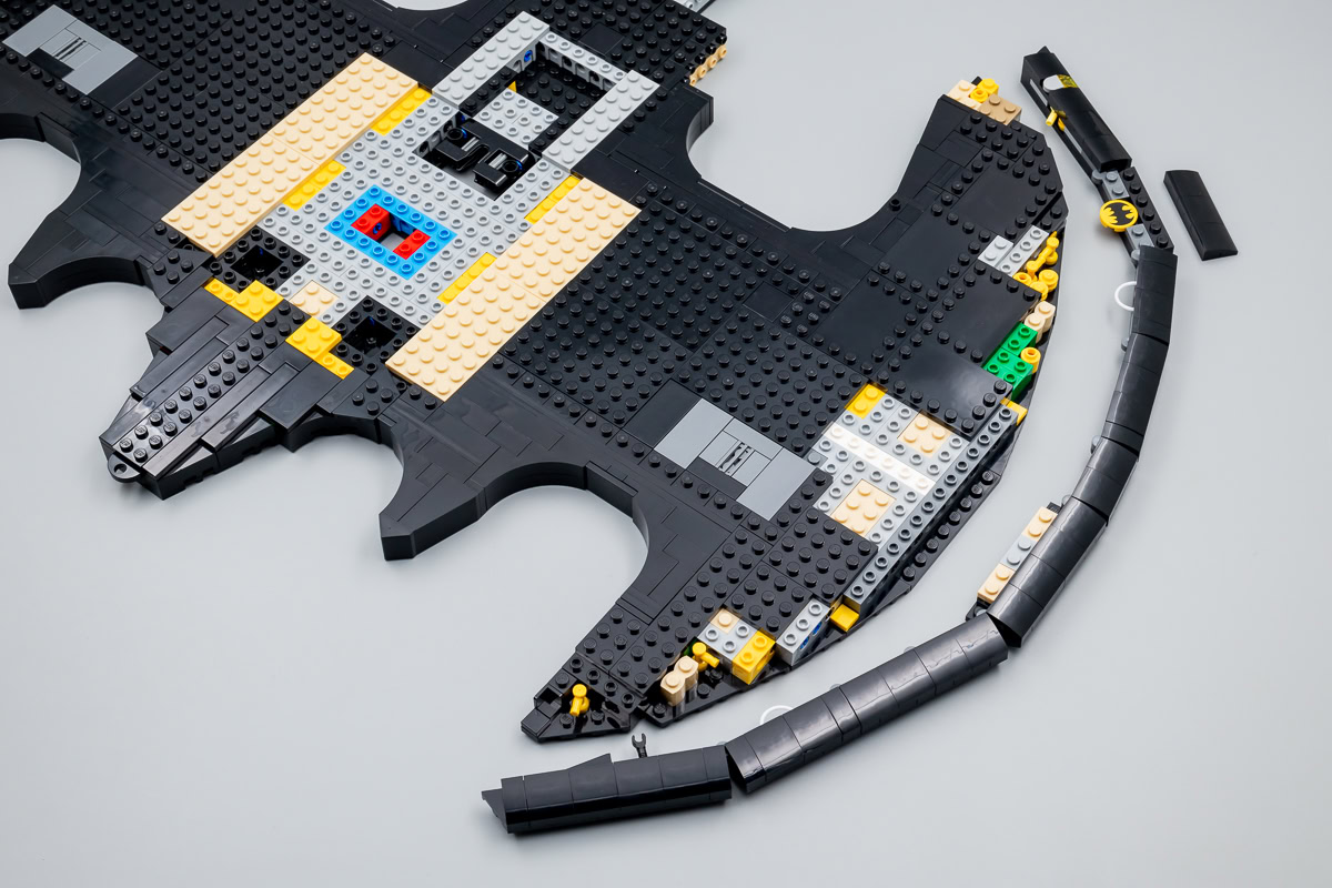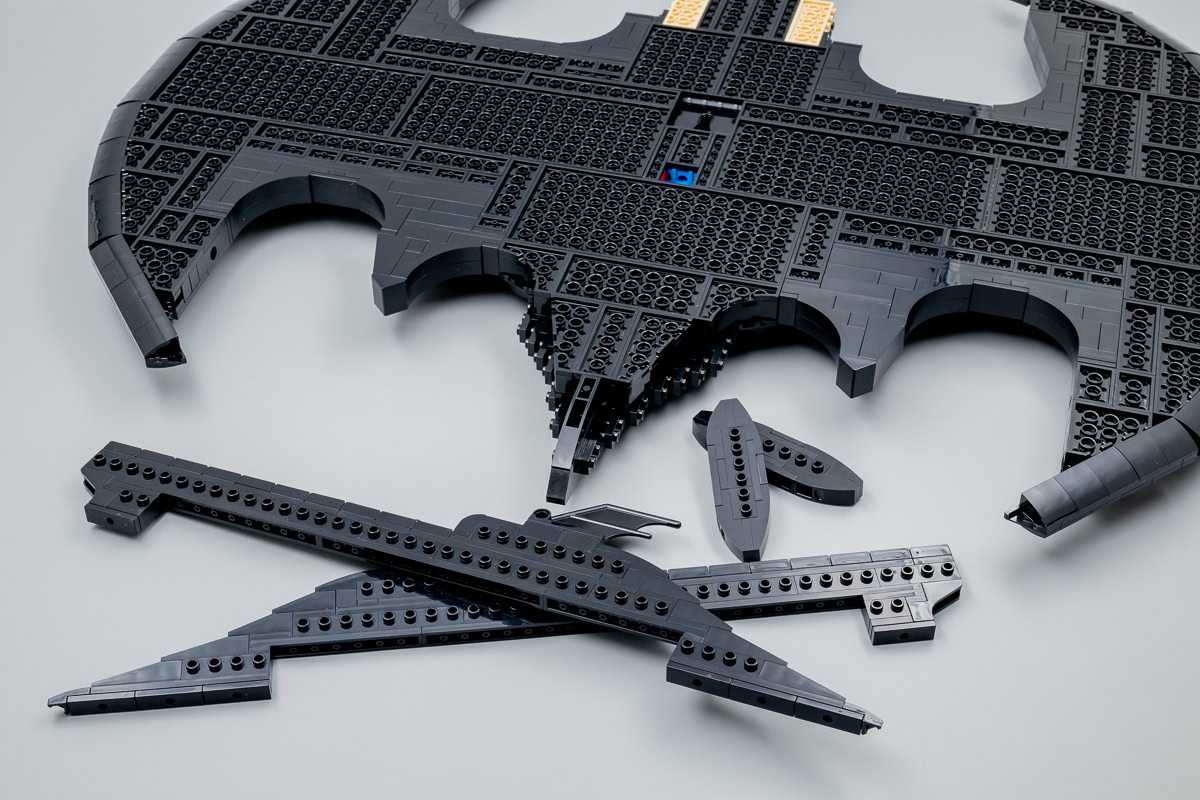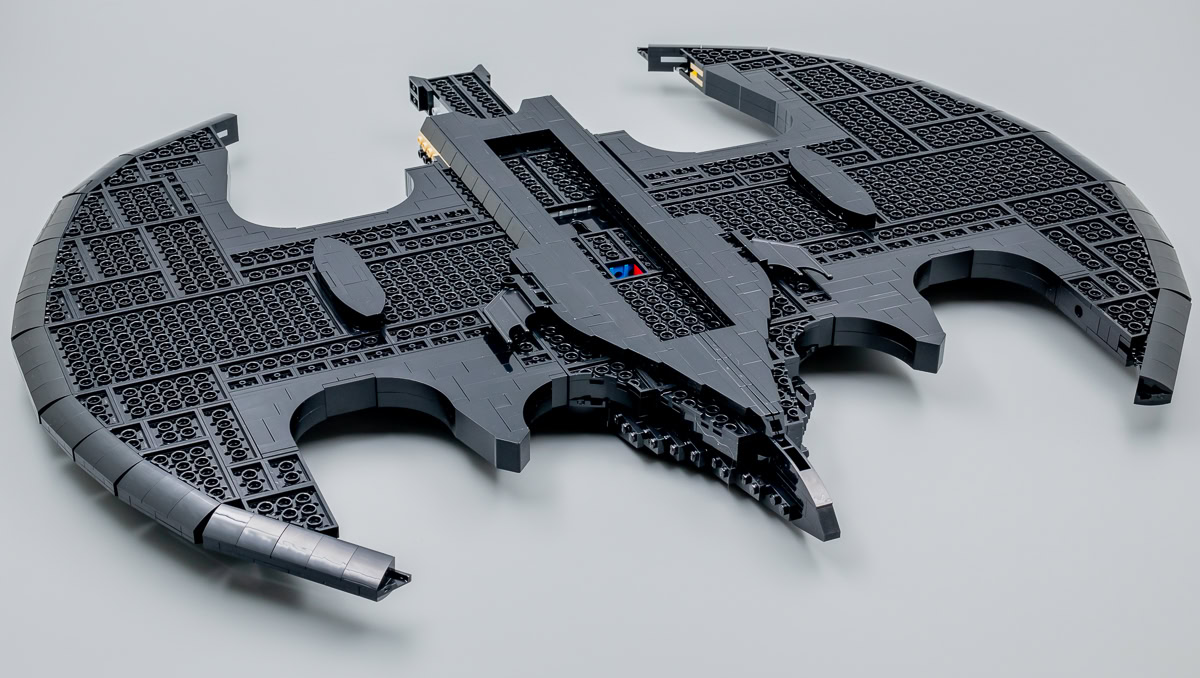 Autant le signaler tout de suite, j'ai pris un peu moins de plaisir à assembler ce Batwing que lors du montage de la Batmobile. Ici, on empile des plaques qui viennent recouvrir l'imposante structure interne basée sur des frames Technic, on construit quelques sous-ensembles en SNOT (Studs Not On Top) pour les excroissances dont la forme n'est pas définie par le châssis central, on reproduit des éléments à l'identique avec un effet miroir indispensable pour obtenir les ailes et il n'y a guère que le poste de pilotage et les différents éléments de décoration qui offrent un peu de variété. Mais la fin justifie les moyens et le résultat final est assez impressionnant avec un engin d'une envergure respectable : 58 cm de large, 52 cm de long.