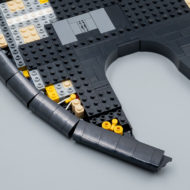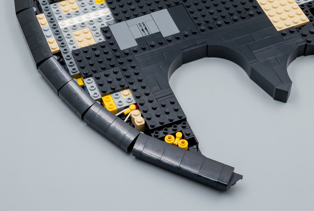 Le designer a bien glissé deux éléments jaunes tampographiés du logo habituel dans chacun des sous-assemblages, mais ce détail qui disparait lorsque les bords d'ailes sont installés ne suffit pas à me convaincre. À titre personnel, j'ai toujours un peu de mal avec les modèles haut de gamme qui font appel à de simples élastiques pour un détail de finition ou une fonctionnalité précise, sachant que LEGO ne fournit même pas d'exemplaires de remplacement.