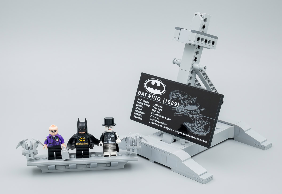 S'il y en a certains qui se posent encore la question, ce Batwing n'est évidemment pas à l'échelle minifig. Mais ce n'est de toute façon pas un jouet pour enfant et cette maquette n'a pour vocation que d'être exposée. Les trois minifigs fournies sont présentées sur une corniche de toit identique à celle du set 76139 1989 Batmobile, à vous d'en faire une seule avec les deux exemplaires en supprimant au passage un emplacement puisque la figurine de Batman est identique dans les deux sets.