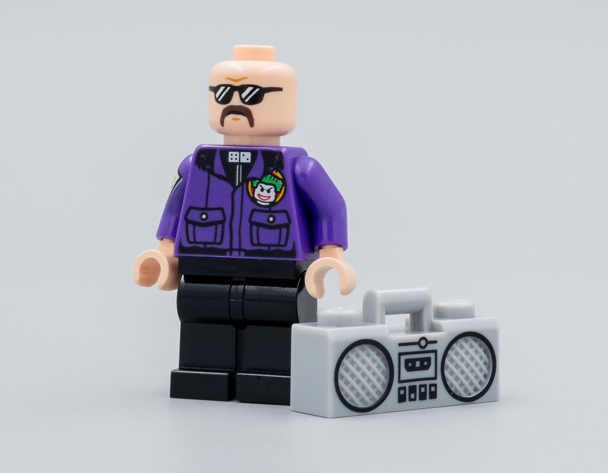 La minifig de Lawrence, l'homme de main du Joker qu'on voit danser avec avec sa boombox sur l'épaule aux côtés de Nicholson dans la scène du musée, est en revanche très réussie avec un torse et un visage vraiment fidèles à la version vue à l'écran. LEGO aurait pu se fendre d'une version noire du ghetto-blaster pour mieux coller à la scène du film, la réutilisation de l'élément générique déjà vu dans plusieurs sets est ici aussi un peu paresseuse.