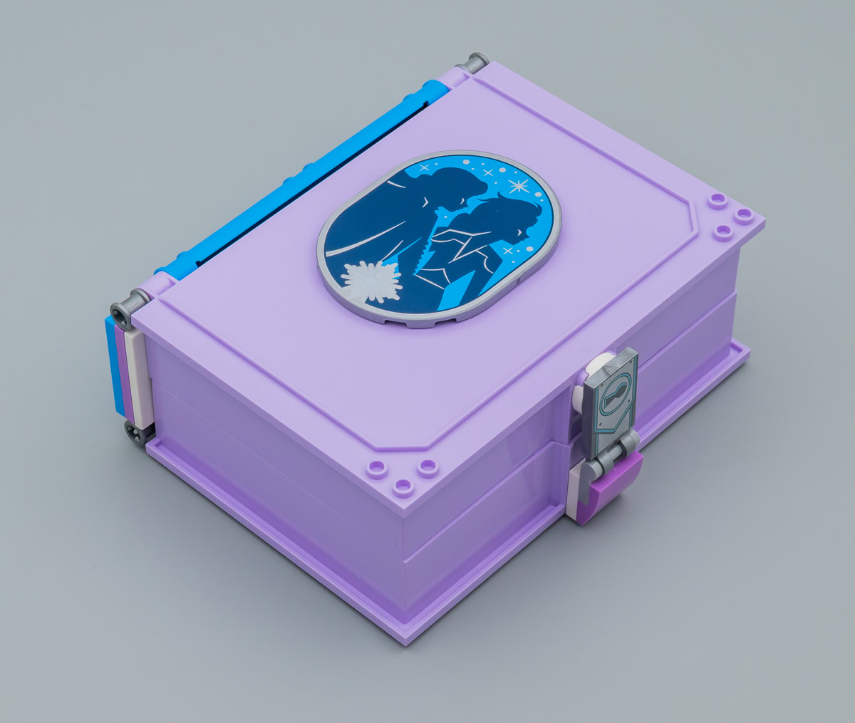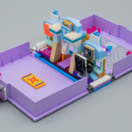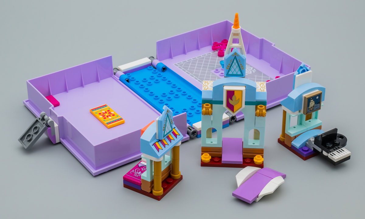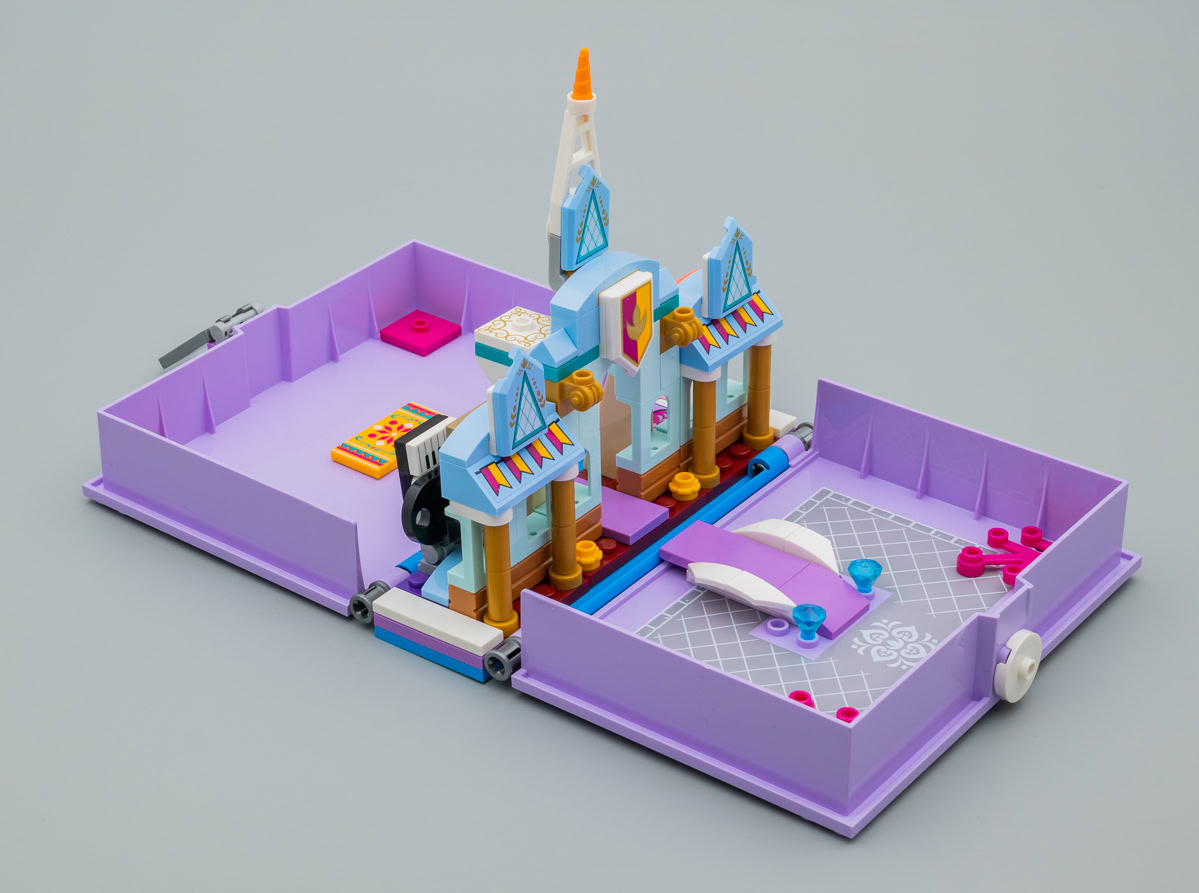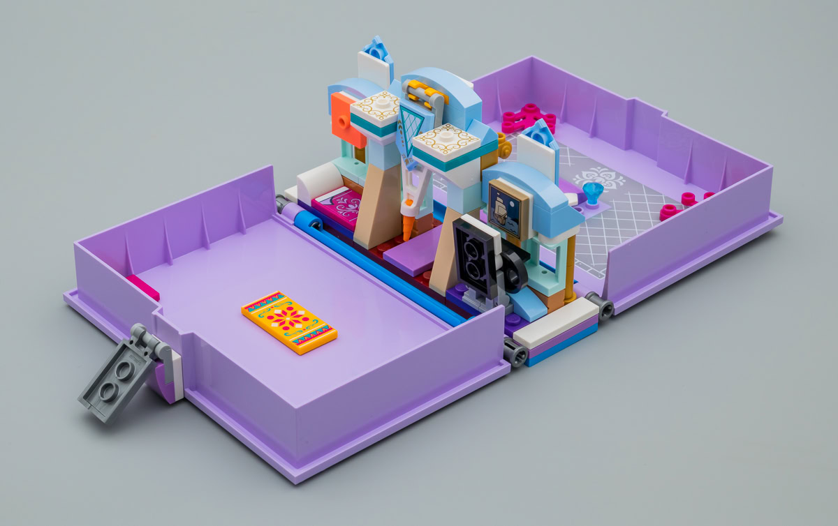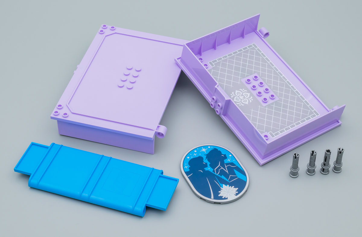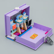 Le principe de la boite en plastique qui sert à la fois d'étui de rangement, de transport et de terrain de jeu n'est pas nouveau chez LEGO : Capsules (Pods), boites cubiques de la gamme LEGO Friends ou encore bornes d'arcade de la gamme Ninjago, le fabricant tente des choses. Ici, la boite prend la forme d'un livre au cœur duquel la partie playset reste installée. Pourquoi pas. Ce n'est pas un livre pop-up, il faut plier et déplier à la main les portions de la construction qui empêchent la fermeture de la boite. L'intérieur de la partie gauche du livre est tampographiée avec un carrelage gris, l'autre partie est neutre.