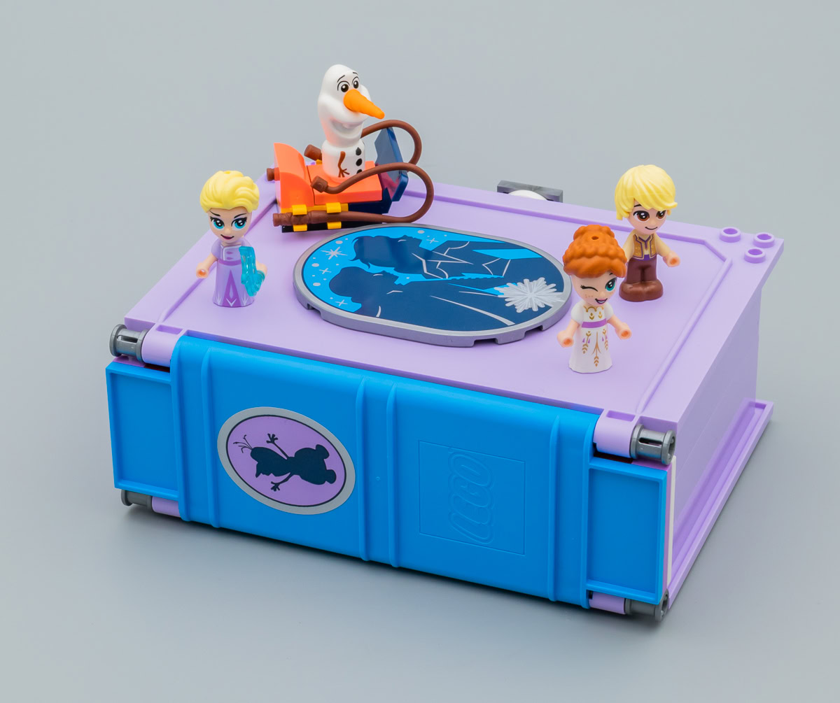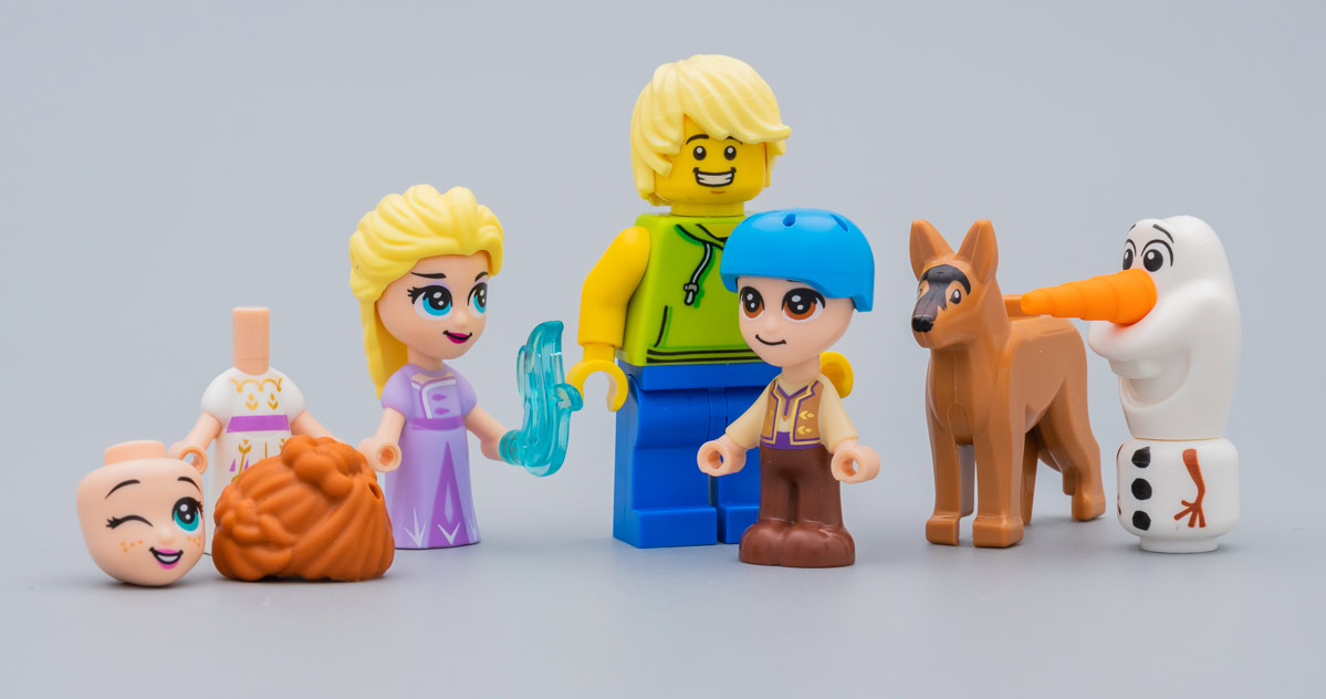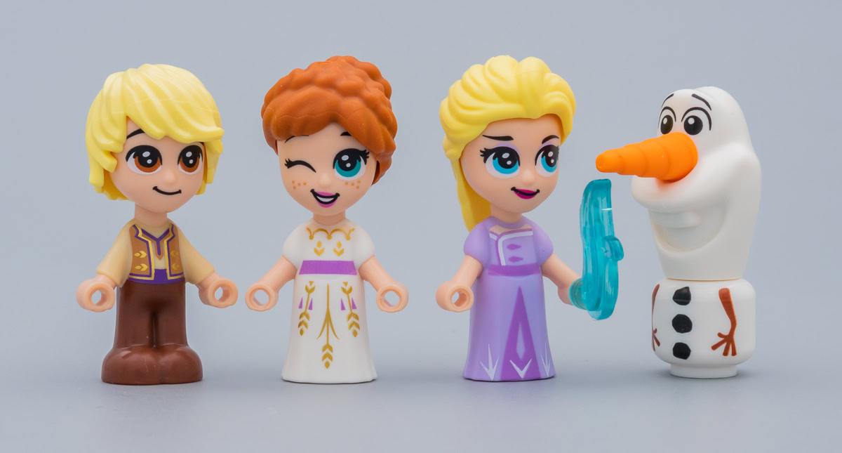 Elsa, Anna et Kristoff sont accompagnés de l'inévitable Olaf qui a lui aussi subi un violent rétrécissement et qui se contente de reprendre sa tête habituelle ici posée sur une tête blanche de minifig classique tampographiée. Les bras des différents personnages sont fixes, il est juste possible de glisser un accessoire adapté dans le trou des mains.