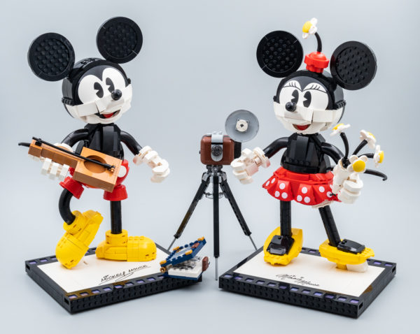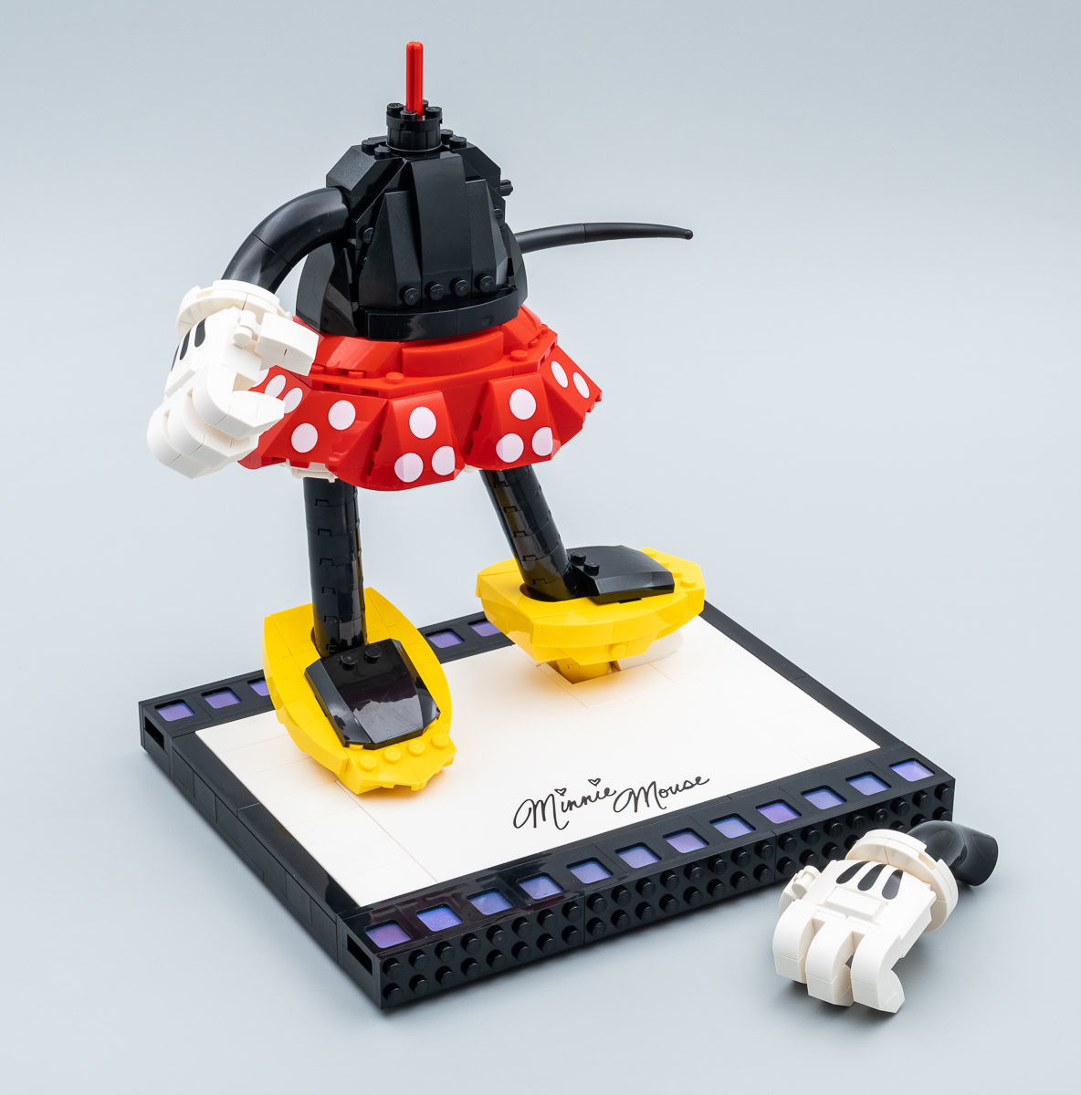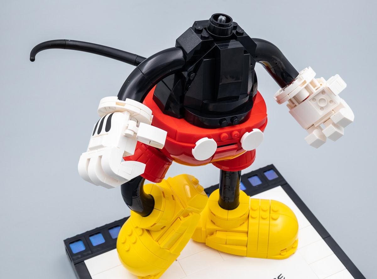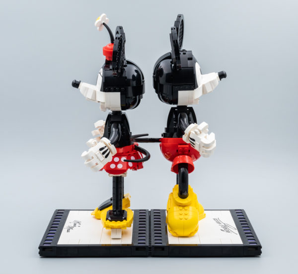 Les deux personnages sont solidement ancrés sur leur support, ce qui permet d'assurer la stabilité de chacune des statues dont l'élément le plus lourd est la tête. La jambe droite de Mickey est la plus réussie, elle est constituée de deux des dix nouvelles pièces courbées à 45° et lisses aussi utilisées pour les bras. Les trois autres jambes sont plus classiques, elles sont droites avec des pièces enfilées sur un axe souple.