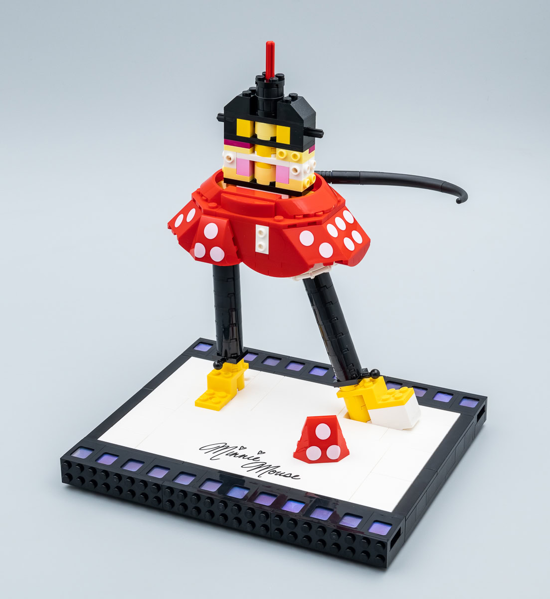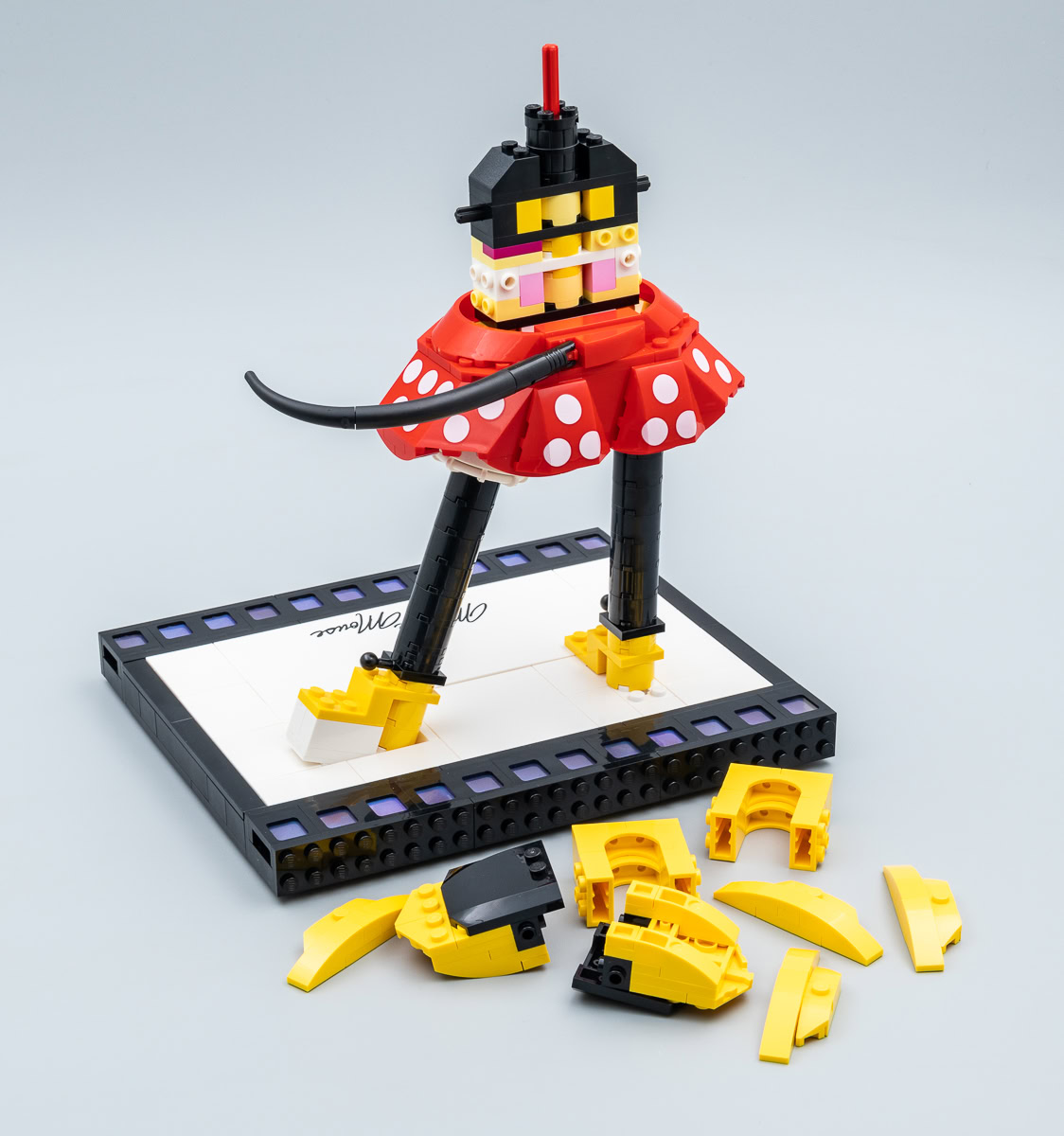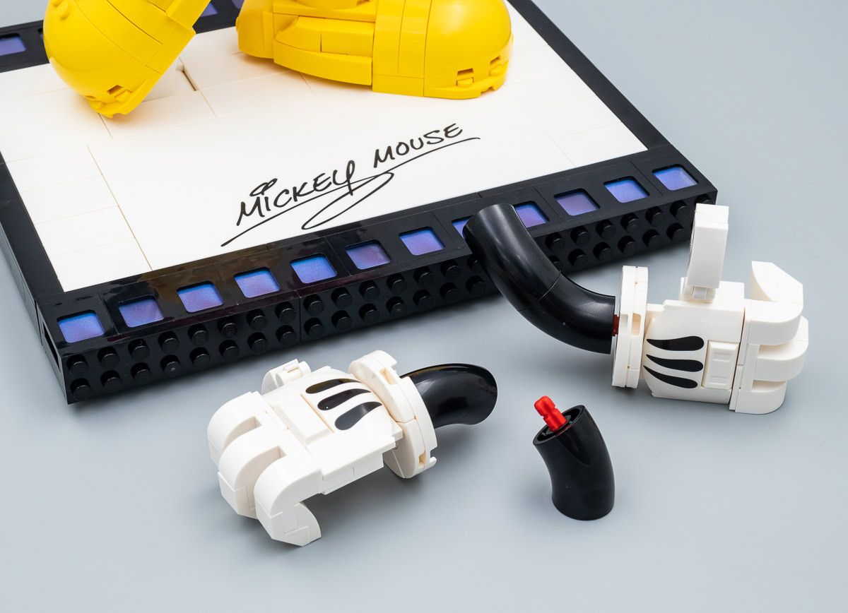 Les deux personnages sont solidement ancrés sur leur support, ce qui permet d'assurer la stabilité de chacune des statues dont l'élément le plus lourd est la tête. La jambe droite de Mickey est la plus réussie, elle est constituée de deux des dix nouvelles pièces courbées à 45° et lisses aussi utilisées pour les bras. Les trois autres jambes sont plus classiques, elles sont droites avec des pièces enfilées sur un axe souple.