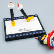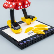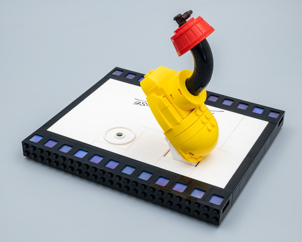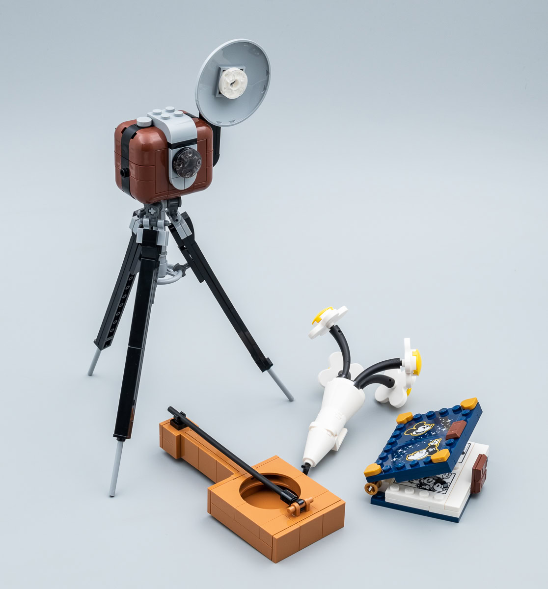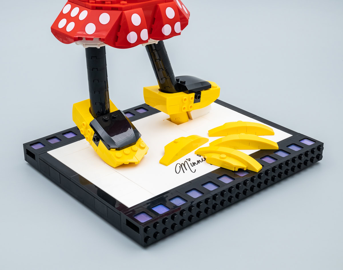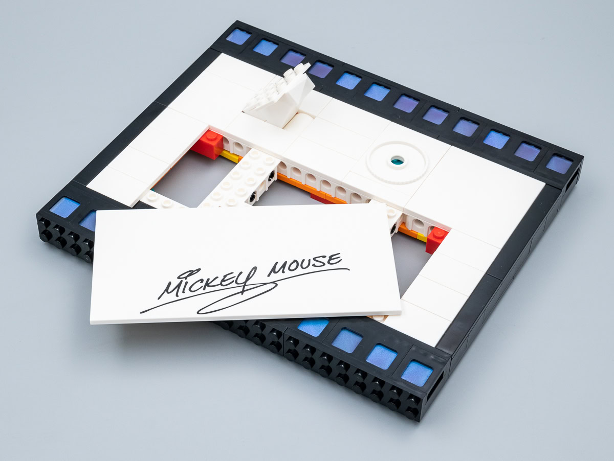 On commence par les jolis socles en forme de négatif photo ou de pellicule de cinéma sur lesquels viennent prendre place les deux personnages. La mise en scène est très intéressante, certains y verront sans doute des personnages qui prennent vie en sortant de leur support 2D. Comme pour les entrailles de Mickey et Minnie, l'intérieur des deux socles basés sur des cadres Technic regorge de pièces colorées, ce qui en plus de faciliter le positionnement de certains éléments rend les instructions sur fond noir plus lisibles.