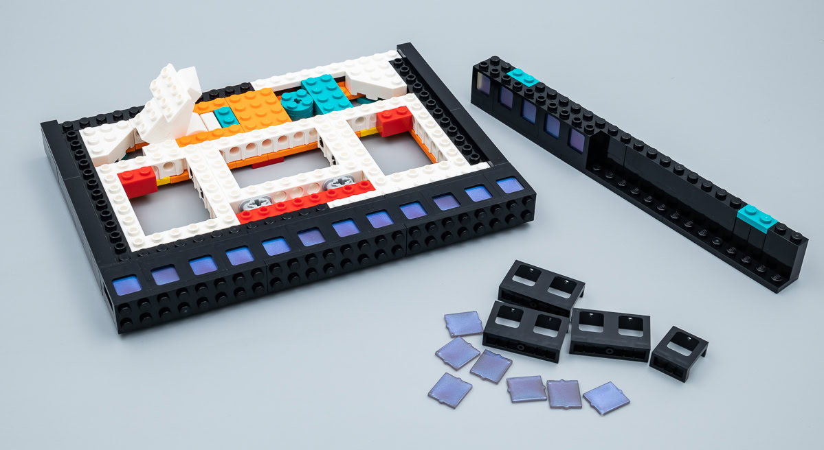 L'effet est obtenu par l'insertion de vitres fumées dans des fenêtres et c'est vraiment très réussi. Ces 48 vitres sont les pièces indiquées comme utilisant la nouvelle couleur qui rejoint la palette LEGO : 363 Transparent Brown with Opalescense. Le résultat est plus bleu que marron.