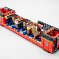 Chacune des trois scènes est éclairée par une brique lumineuse classique et il faudra donc maintenir le doigt sur le bouton qui dépasse du toit du wagon pour ajouter une petite touche lumineuse à la scène. Si vous n'avez pas l'intention de vous contenter d'admirer vos minifigs à travers les vitres du wagon, vous pourrez toujours retirer les sections latérales amovibles qui autorisent un accès aux différents espaces. Le tender va de son côté à l'essentiel : l'intérieur du wagonnet est vide et quelques pièces noires incarnent vaguement les morceaux de charbon en surface.