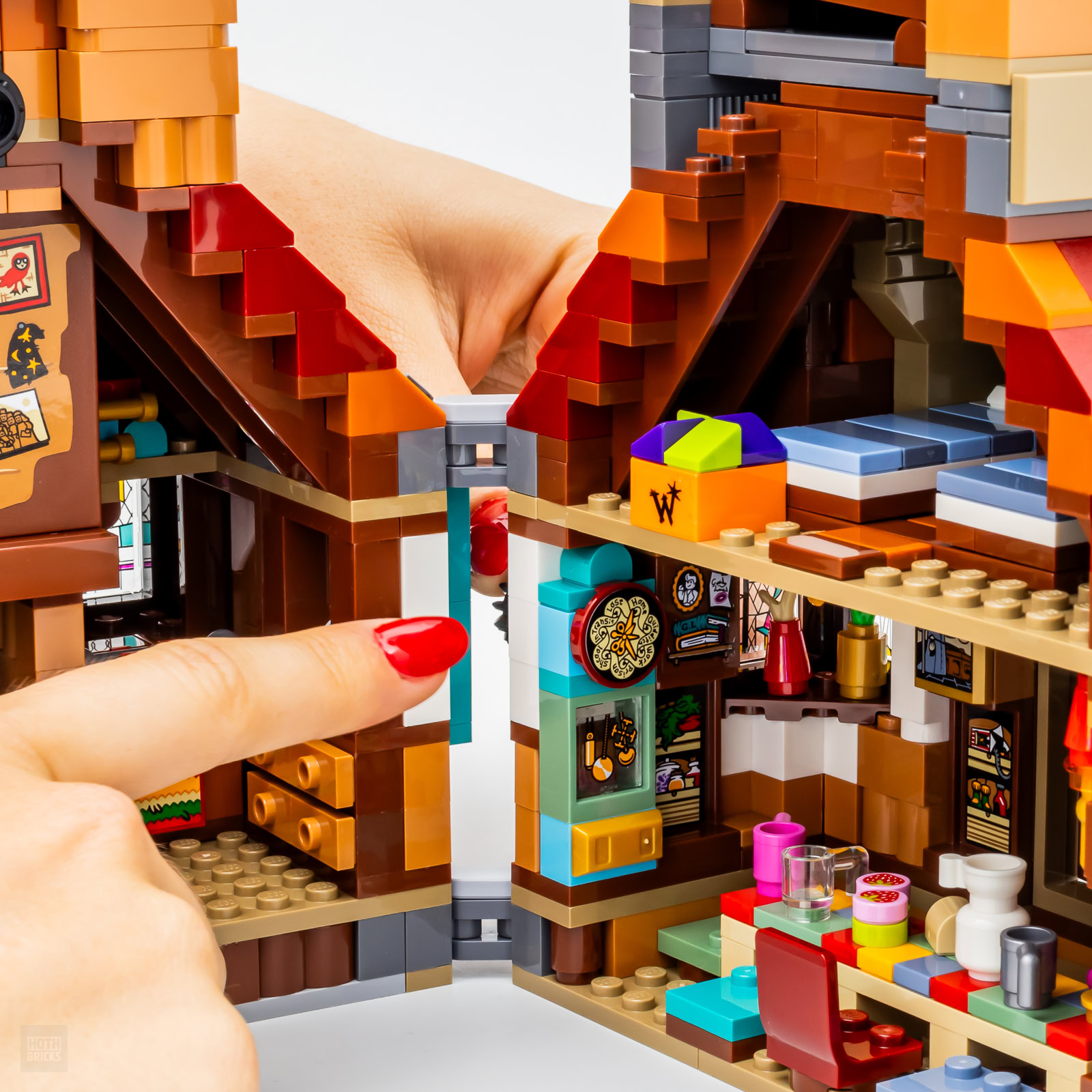 On retiendra également la présence quelques fonctionnalités qui permettront de s'amuser un peu à l'occasion avec le support sur vis sans fin placé dans la cheminée qui permet de reproduire à l'aide de la molette apparente les déplacements possibles grâce à la Poudre de Cheminette, le bouton qui permet de mettre la brosse en mouvement sur la vaisselle de la cuisine ou encore l'autre molette plus discrète qui fait tourner l'horloge des Weasley. Il est également possible de retirer une section placée au sommet du bâtiment pour accéder à la pièce qui se trouve dessous.