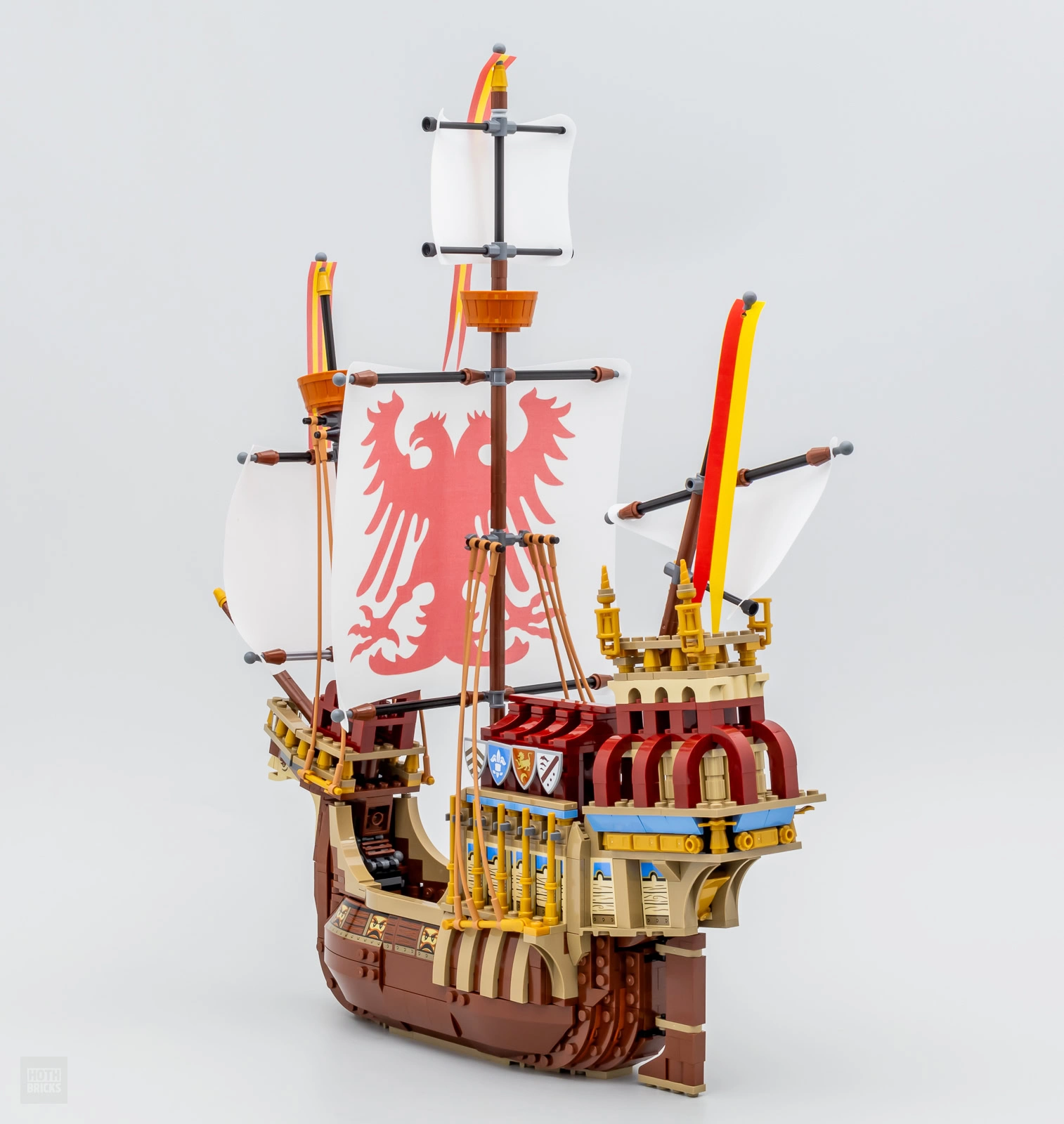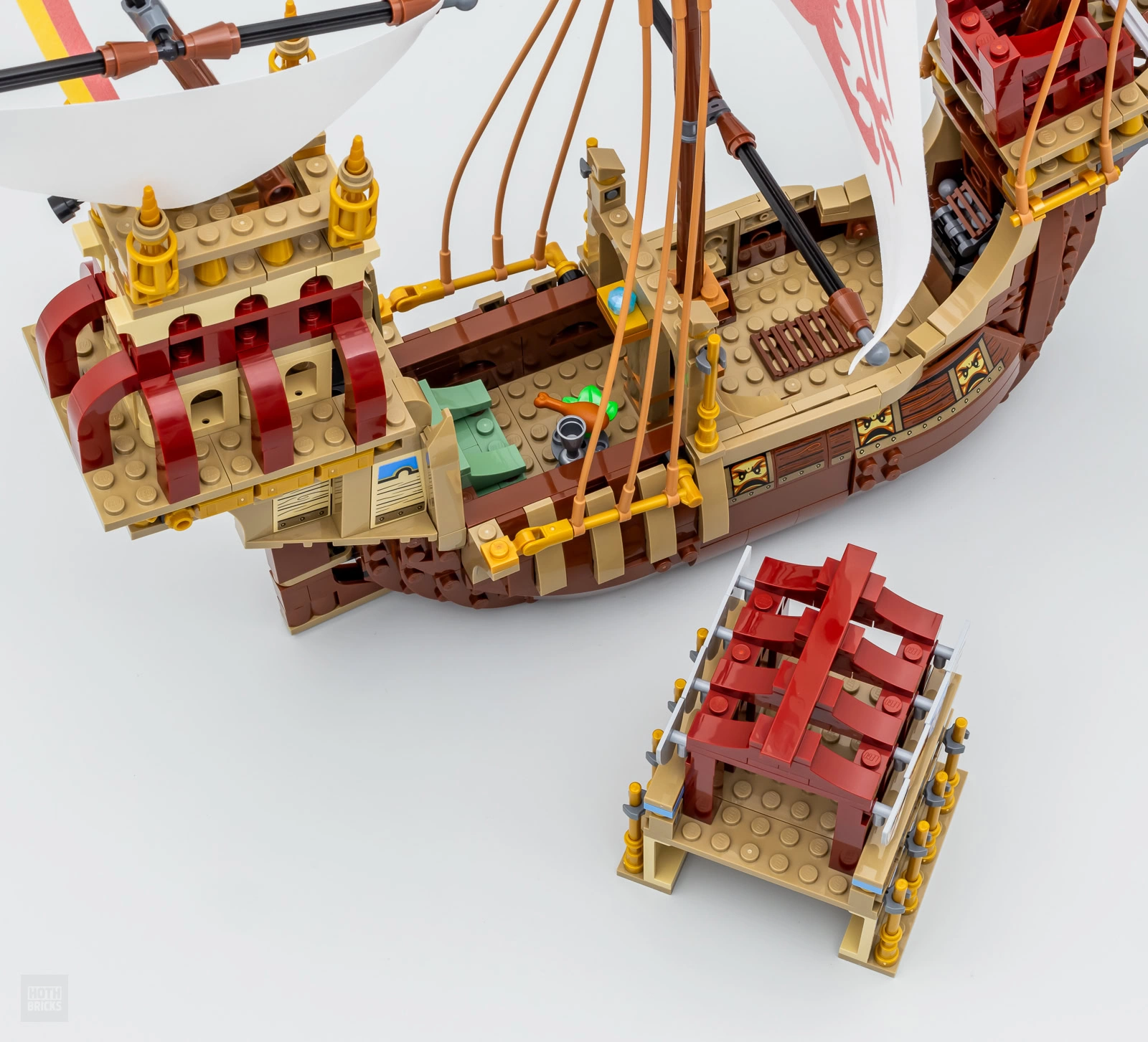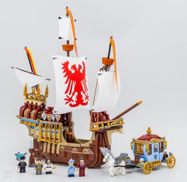 On peut imaginer que le carrosse n'est pas la star du set et qu'il ne s'agit en fait que d'un "bonus" pour accompagner le bateau des Durmstrang. Celui-ci est plutôt fidèle à la version vue à l'écran même si la construction de 35 cm de long sur 45 cm de haut fait forcément l'impasse sur quelques détails. Les courbes du vaisseau sont respectées, LEGO intègre le bon nombre de mats et de voiles et l'objet n'utilise pas de méta-pièces pour la coque ce qui a le mérite de permettre à cette boite d'offrir une belle expérience d'assemblage.