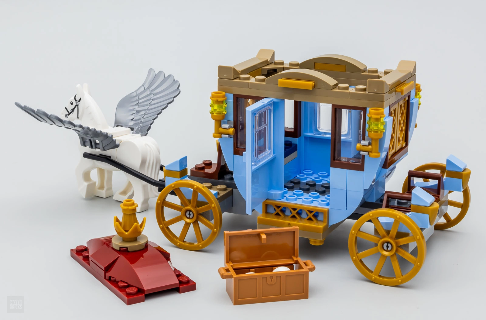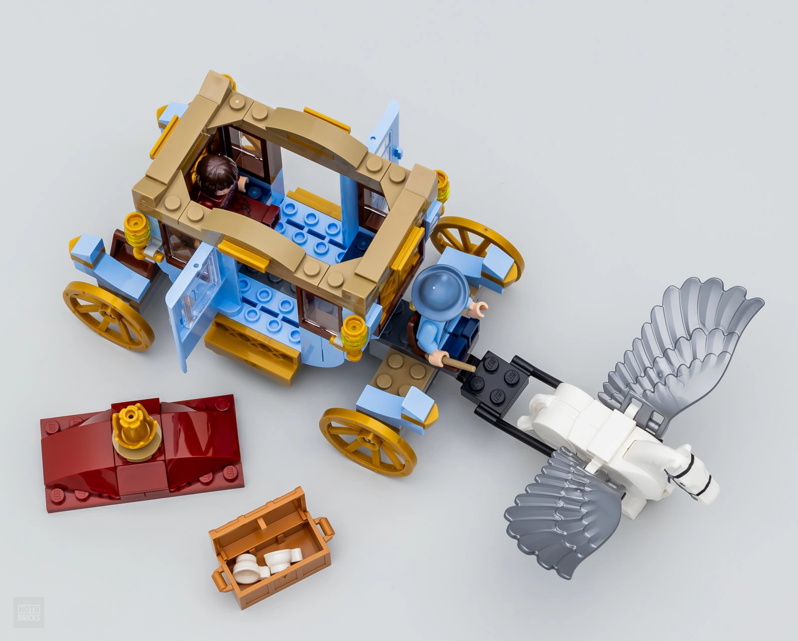 Ce dernier était en effet largement plus détaillé dans le set 75958 Beauxbatons’ Carriage: Arrival at Hogwarts (430 pièces - 49.99 €) commercialisé en 2019, il prend ici des airs de carrosse de la gamme Disney et il faut cette année se contenter d'un seul Abraxan pour le tirer. C'est un peu triste en l'état même si on peut lui retirer le toit pour y installer des figurines et que les portières s'ouvrent des deux côtés.