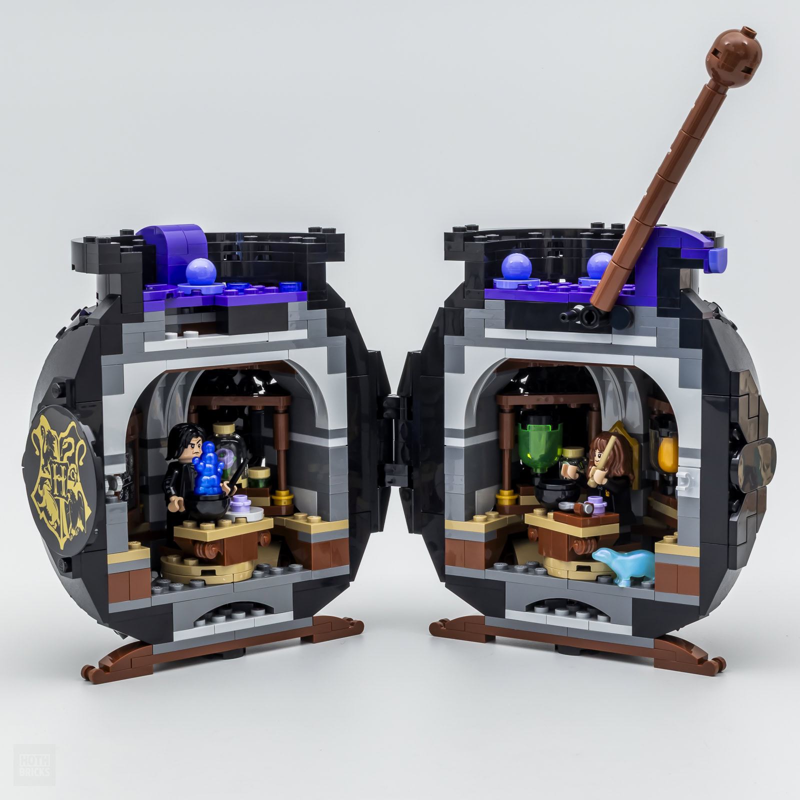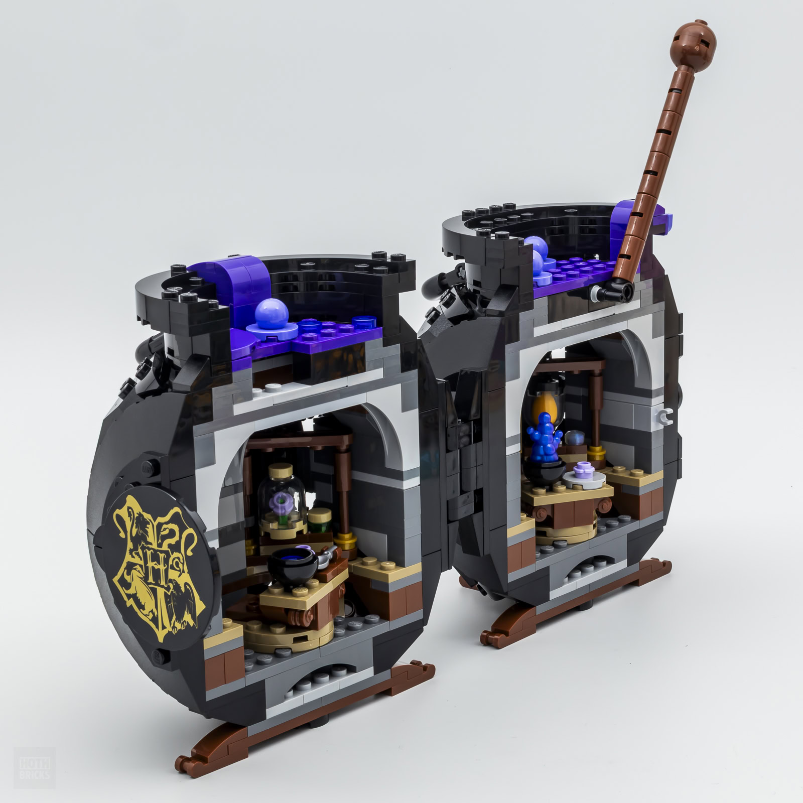 Le manche sert à ouvrir la construction, il suffit de le basculer pour déclencher l'ouverture. les deux demi-sphères contiennent de nombreux éléments avec à l'arrivée une mini-salle de classe plutôt correcte et bien aménagée. Deux sous-ensembles peuvent être extraits pour les exposer à l'avant du chaudron et y installer les deux personnages fournis.