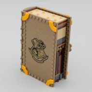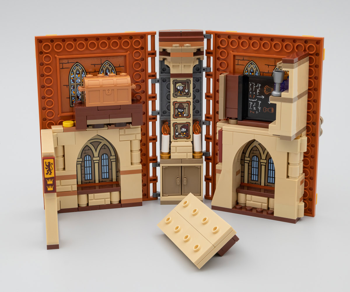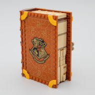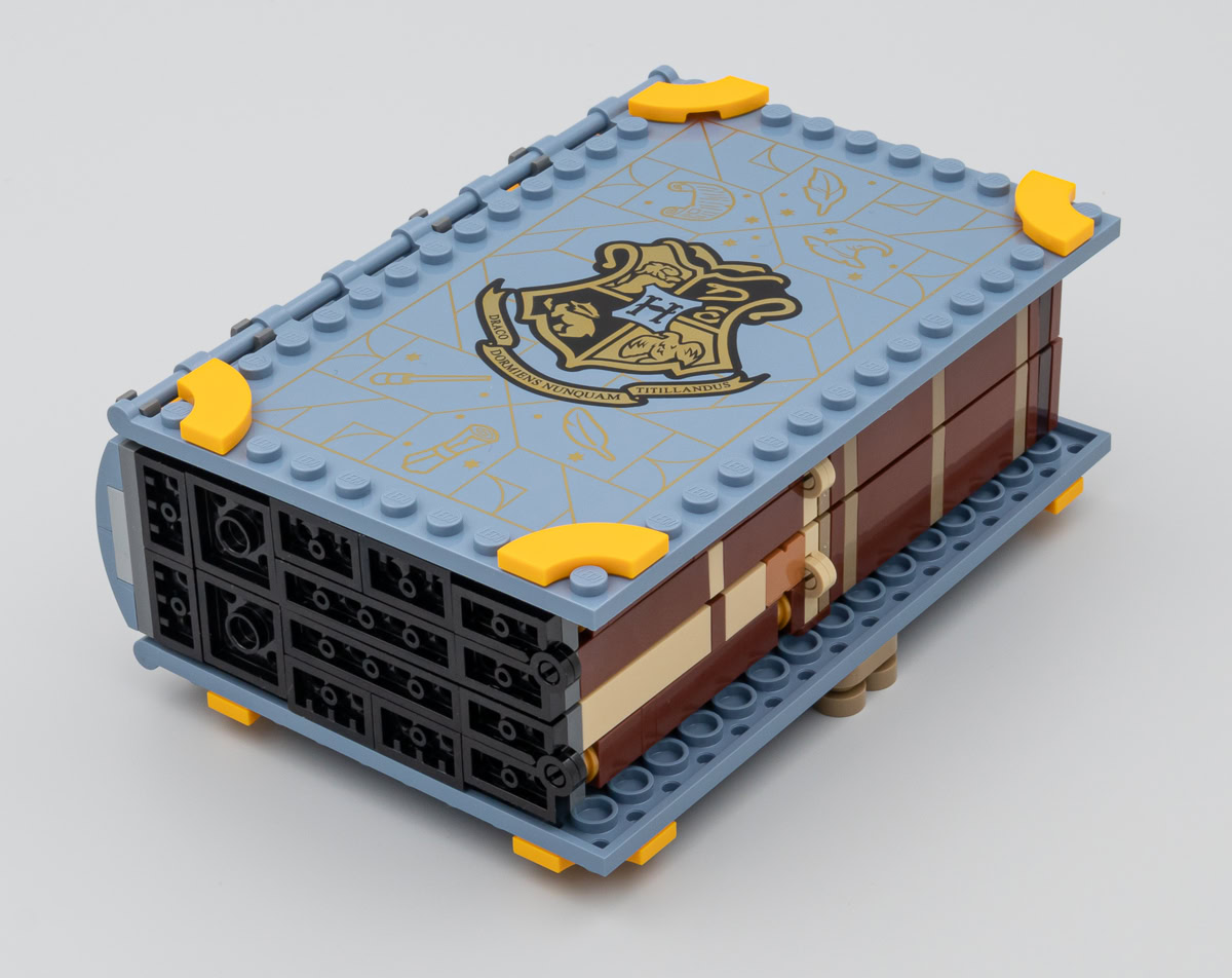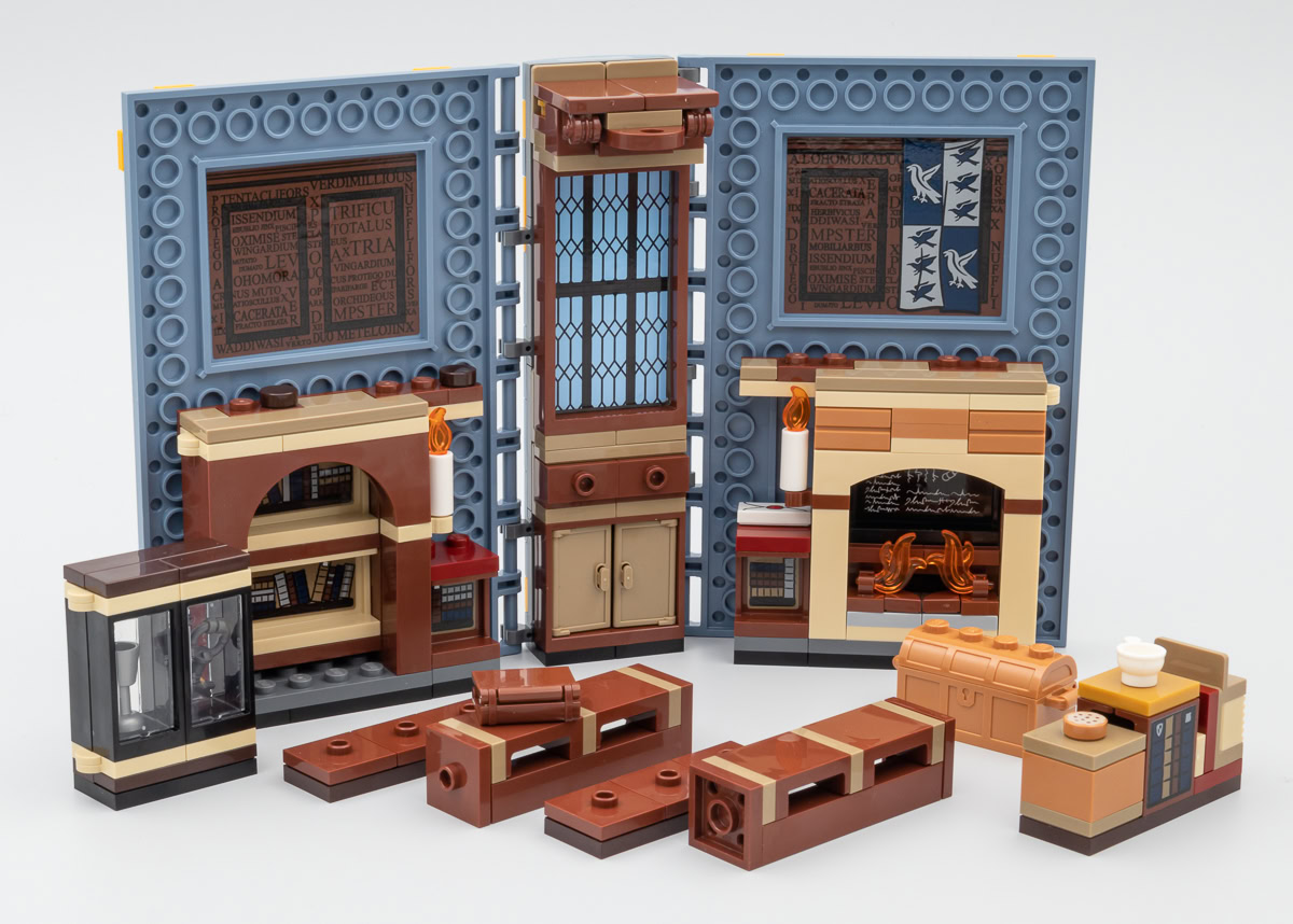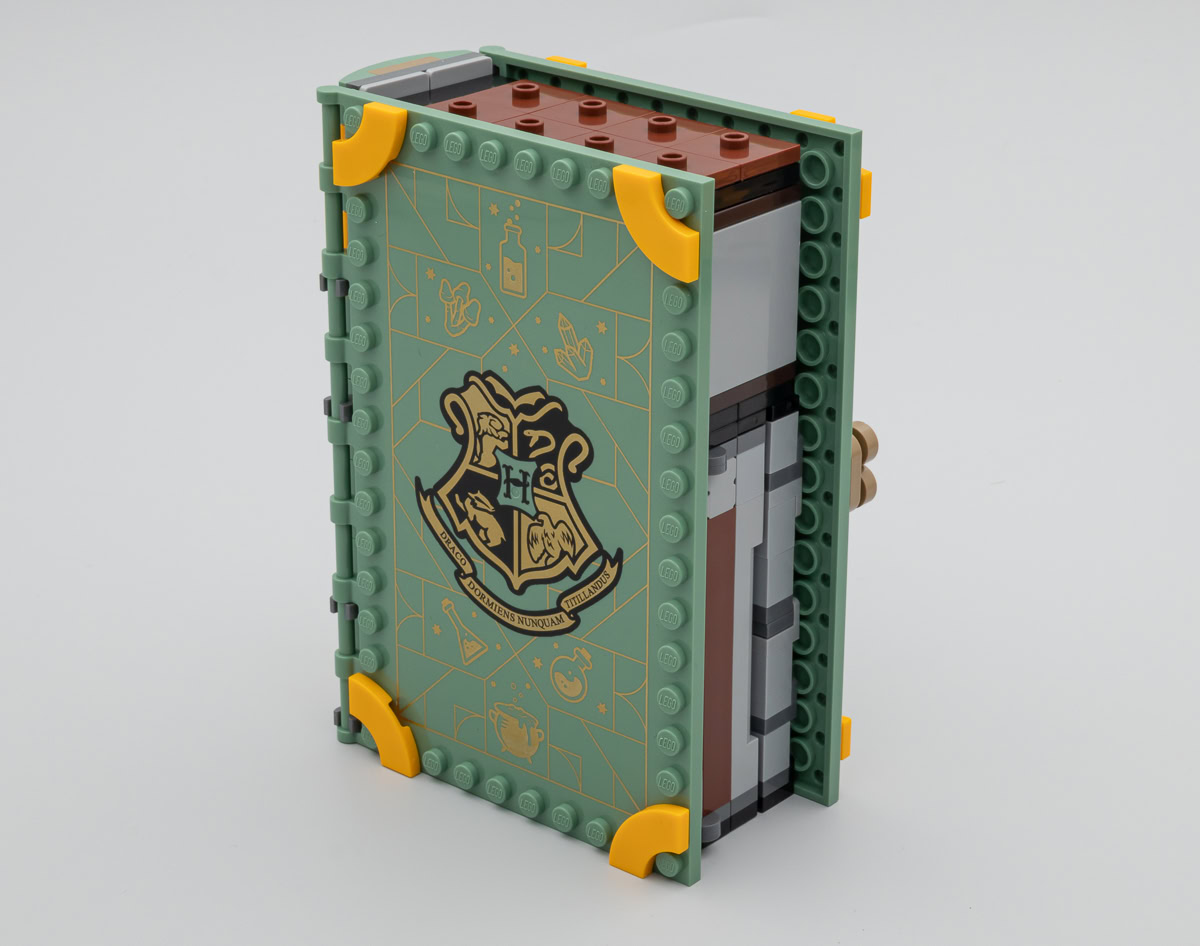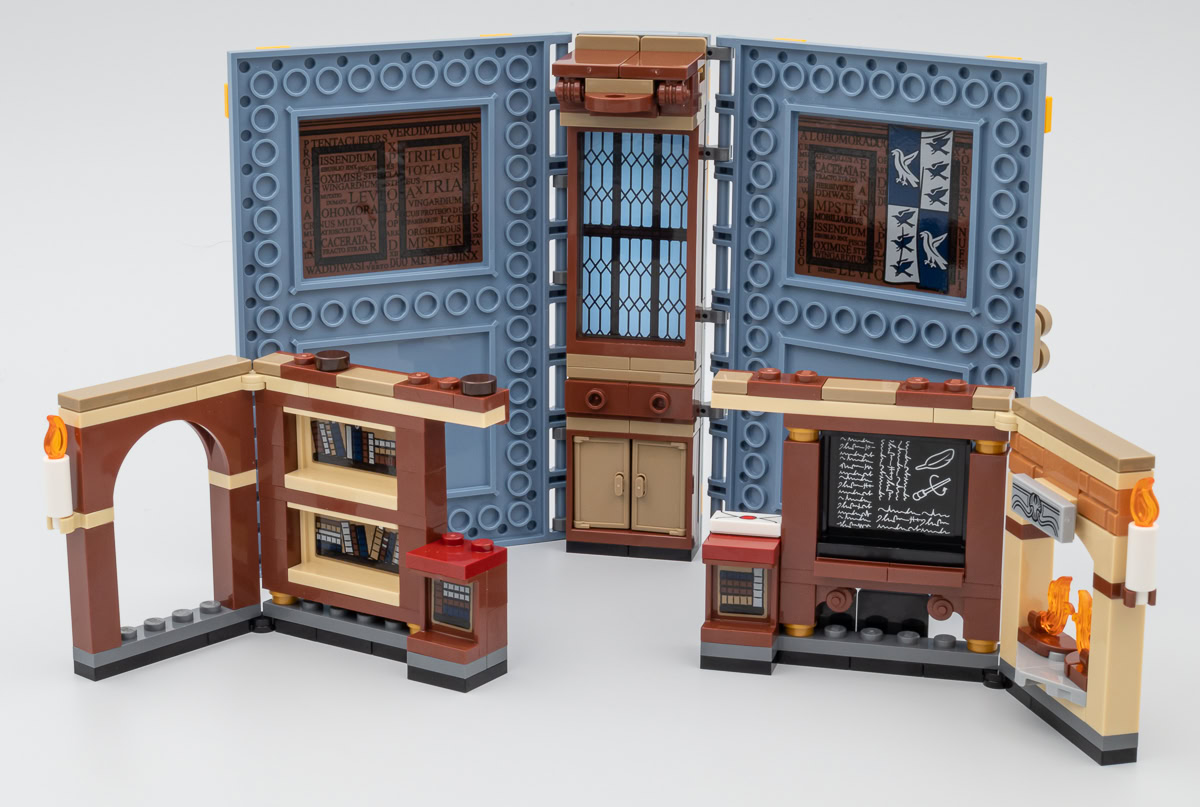 Chacun de ces playsets est construit sur le même principe que les trois autres et les variations se situent au niveau du mobilier et de son agencement pour permettre la fermeture du bouquin et constituer une tranche à peu près homogène. Seule la face avant de la couverture est tampographiée, le plat de derrière reste vide. Ceux qui avaient imaginé que le dos serait lui aussi tampographié en seront pour leurs frais, il faut se contenter d'un sticker thématique un peu grossier dont la couleur de fond n'est même pas raccord avec la teinte de la pièce sur laquelle il prend place. Aucune mention même discrète sur le dos de l'appartenance de ces différents ouvrages à l'univers Harry Potter, c'est dommage.