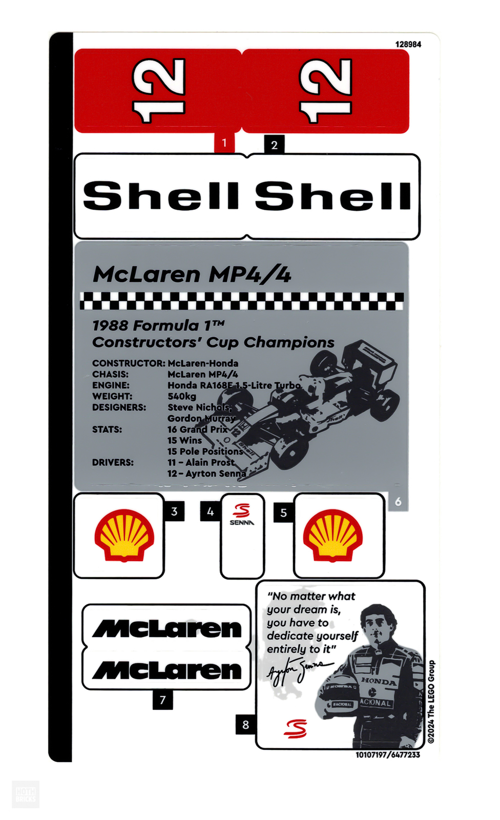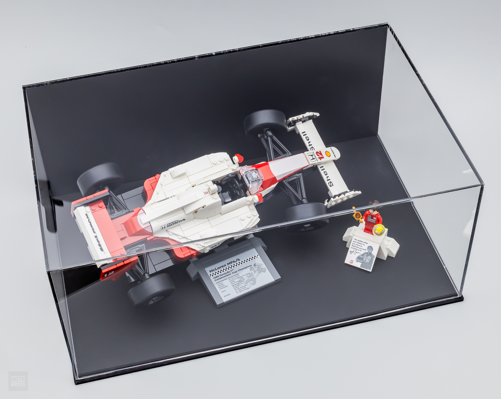LEGO rend donc ici un hommage appuyé au pilote en l'associant à une monoplace longtemps considérée comme la plus rapide du circuit, la McLaren MP4/4, et qui lui a permis de devenir champion du monde en 1988.