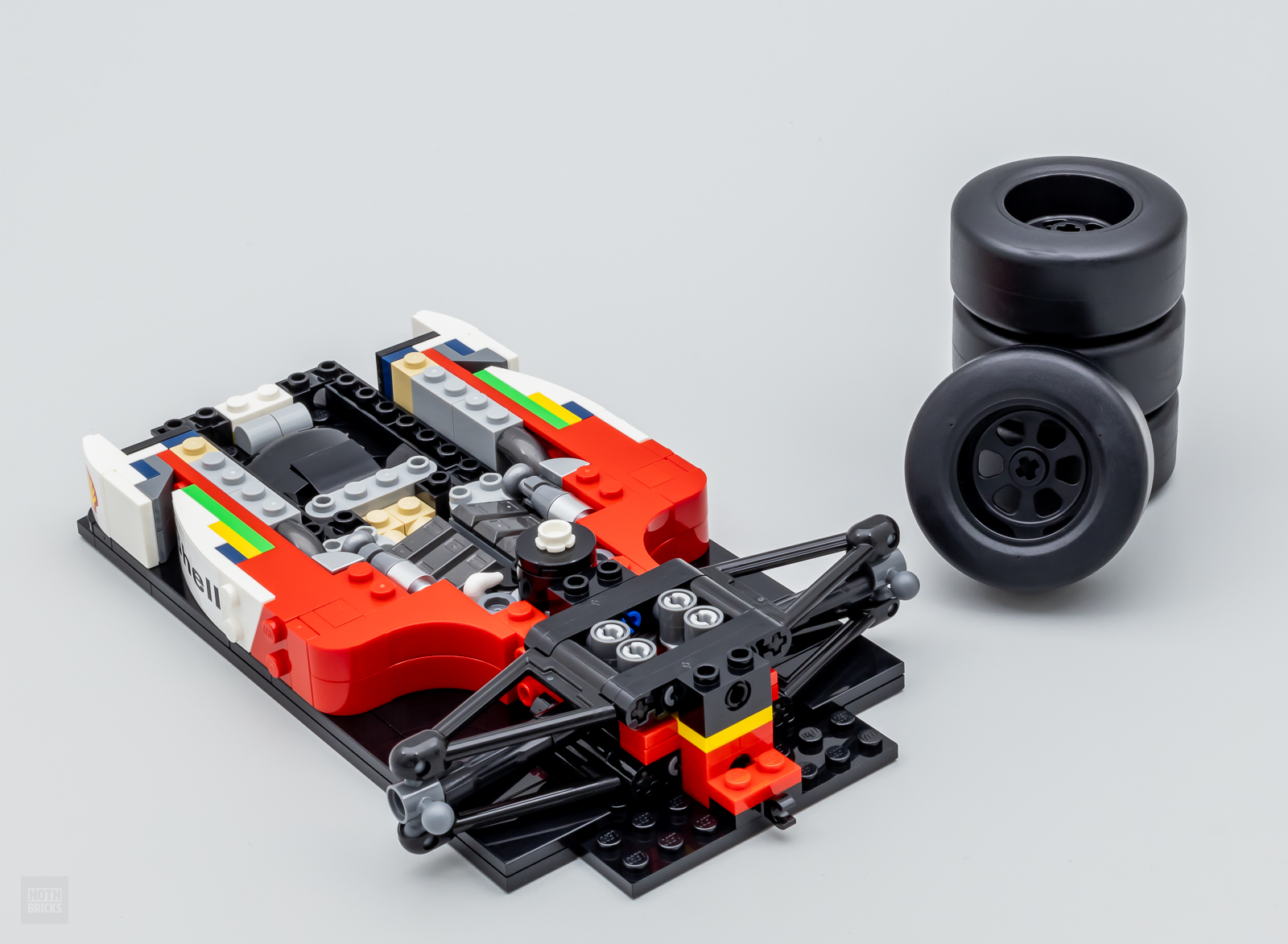 LEGO fait d'ailleurs l'effort de mettre ici en scène quelques nouveaux éléments utilisés à bon escient avec quatre roues injectées en deux matières dont les jantes et les pneus ne sont pas dissociables ainsi que des triangles de suspensions inédits. Le tout est vraiment au service de la construction en permettant de maintenir le véhicule très proche du sol comme la vraie monoplace et contribue à lui donner du cachet en peaufinant l'aspect maquette et ces quatre nouvelles roues sont enfin parfaitement adaptées au sujet traité même si elles sont toutes de la même taille et que les roues arrières auraient profité d'un diamètre et d'une épaisseur supérieurs.