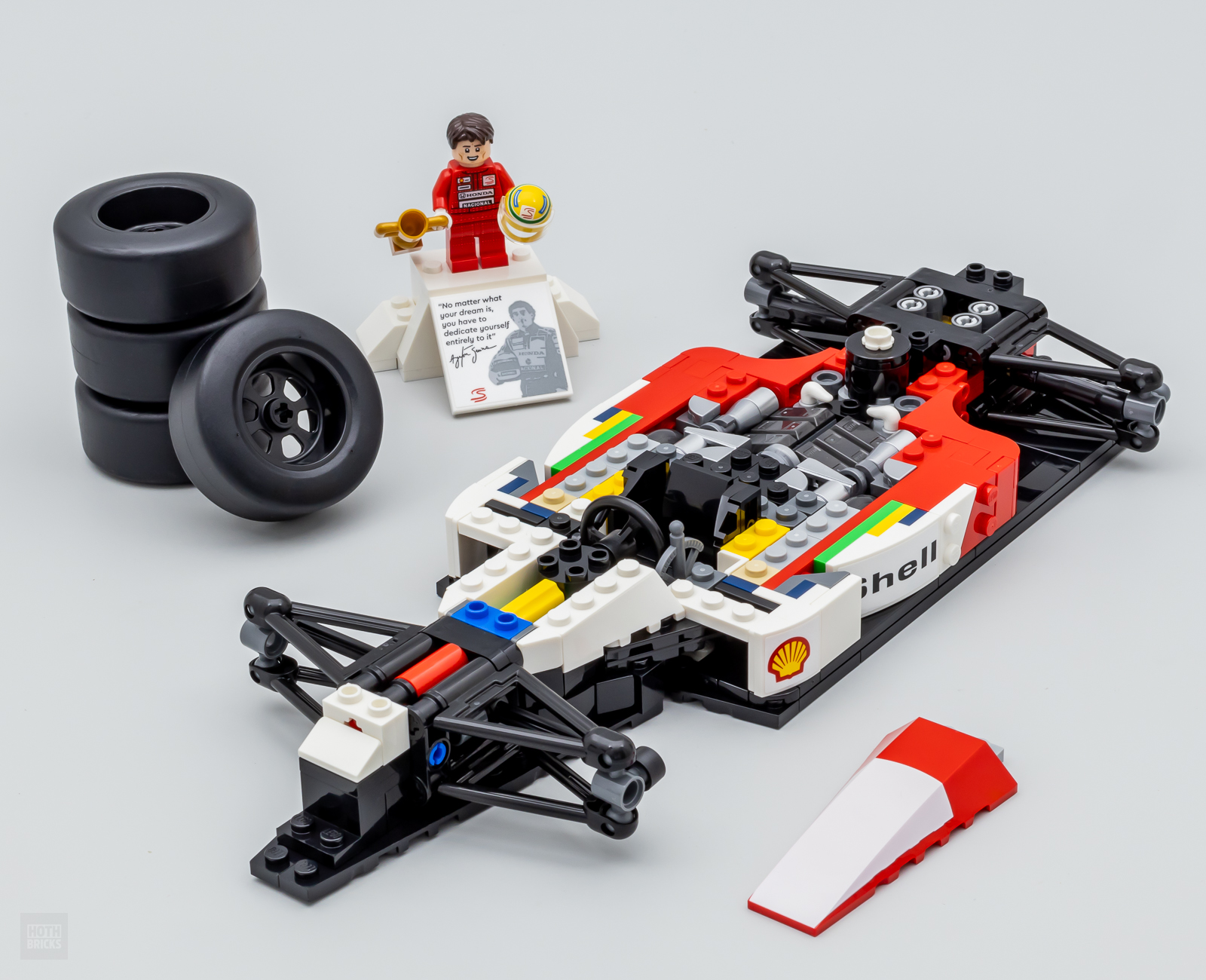 LEGO se contente d'ailleurs de nous fournir l'un des deux pilotes de la monoplace en question, occultant Alain Prost pour appuyer l'hommage au brésilien dont la nationalité est d'ailleurs soulignée à plusieurs reprises durant le processus d'assemblage via l'association de pièces aux couleurs du drapeau national du Brésil.