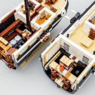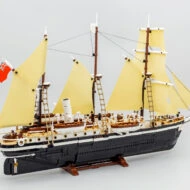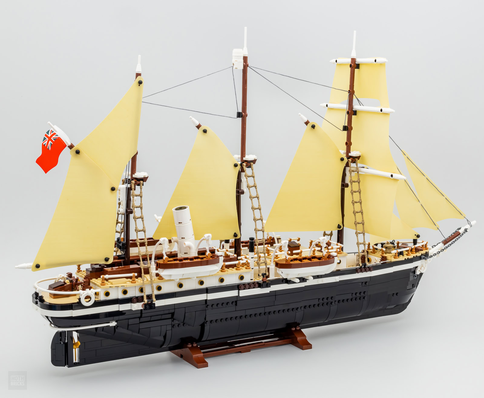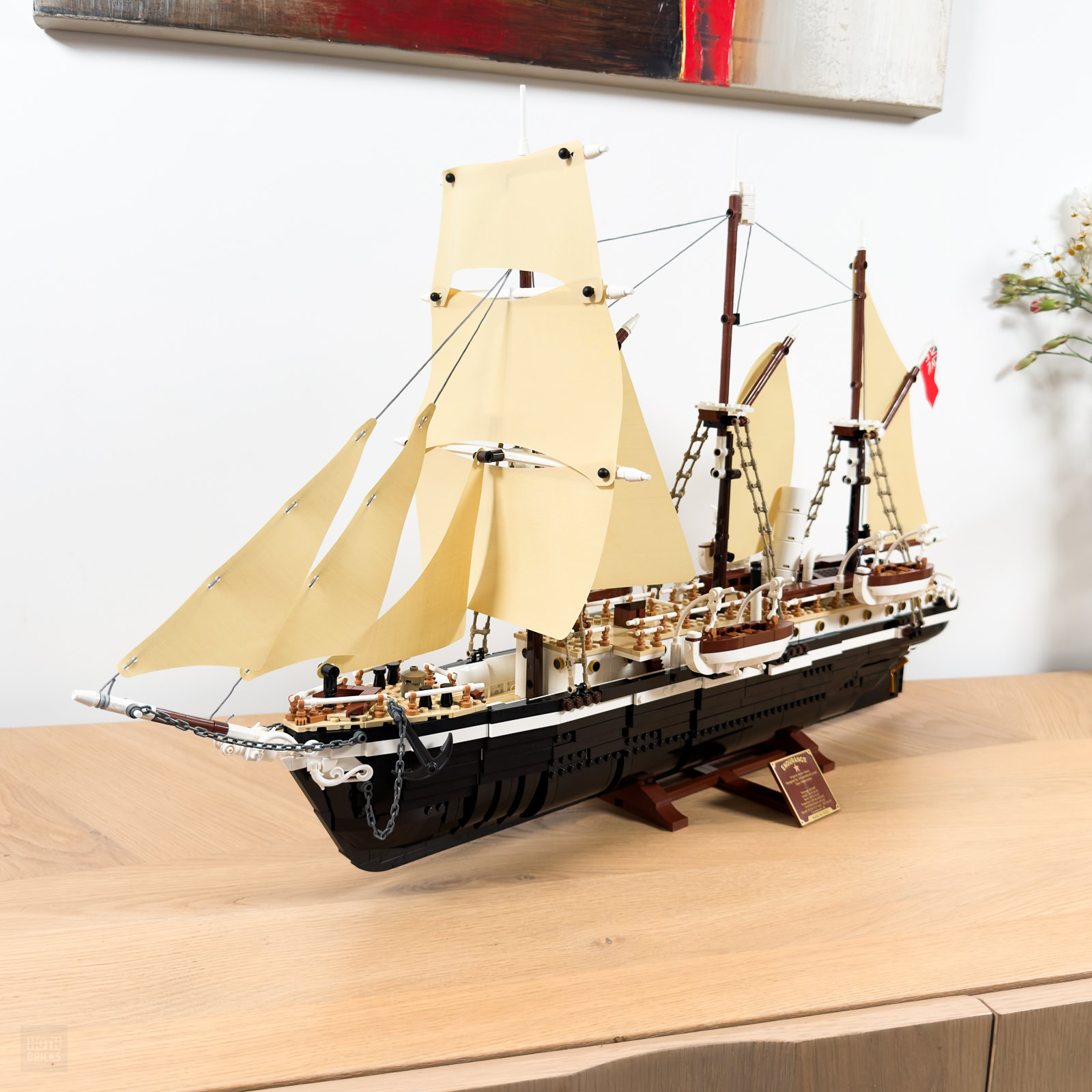 Il s'agit en revanche d'une très jolie maquette d'exposition de 80 cm de long sur 47 cm de haut et 24 cm de large suffisamment neutre pour trôner sur une commode : l'ensemble a des airs de maquette au sens habituel du terme sauf qu'ici le plastique remplace le bois ou le balsa et on conserve le fil à coudre qui court entre les mâts ainsi que les morceaux de tissus qui incarnent les voiles. LEGO a volontairement joué la carte d'un relatif mais convaincant trompe-l'œil pour assurer à cette construction tout son potentiel lifestyle et séduire ainsi tous ceux qui sont friands de ces maquettes au niveau de détail très poussé.