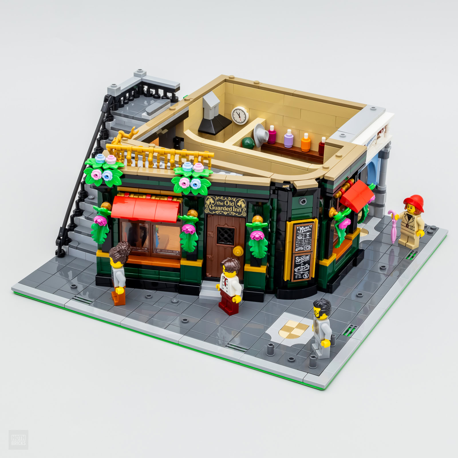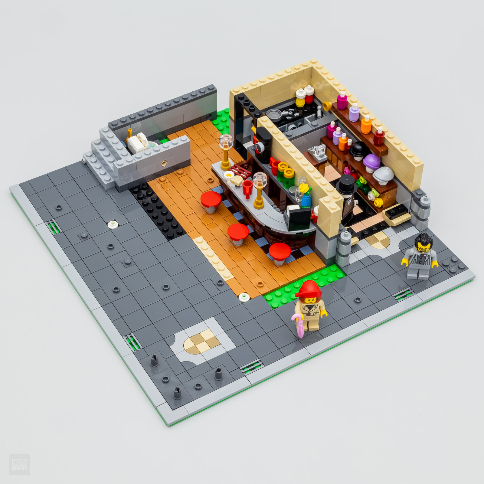 Vous l'aurez compris en regardant les photos ci-dessus, le bâtiment n'occupe qu'une partie de la plaque de base 32x32 fournie, le reste étant composé de trottoirs sur deux cotés. Certains s'en offusqueront peut-être, mais c'est le lot habituel de ces Modulars qui forment un coin de rue et qui semblent à première vue occuper plus d'espace mais qui finalement se contentent d'une portion réduite de leur support.