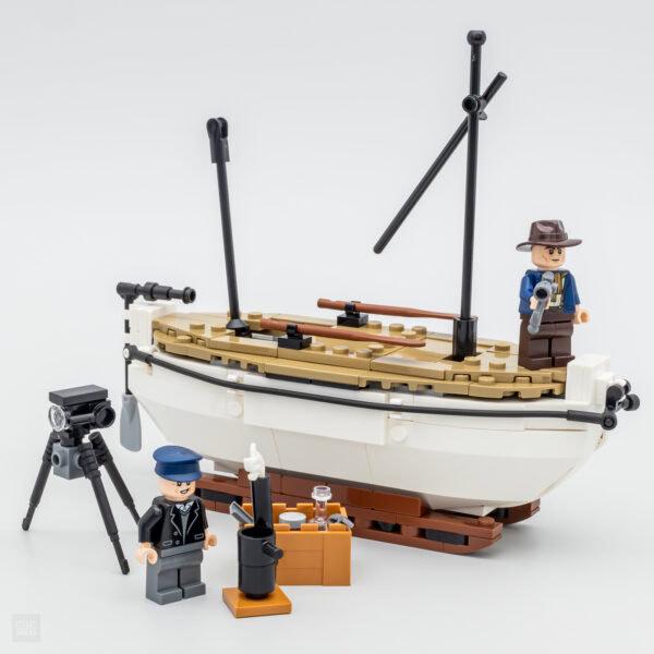 Vous le savez déjà, ce produit promotionnel est le complément idéal de la grosse boite qui permettra d'assembler une maquette de l'Endurance, il met en scène l'explorateur Sir Ernest Shackleton et l'aventurier et cinéaste Frank Hurley. Le canot de sauvetage proposé ici, qui servit aux naufragés pour se réfugier vers l'île de l'Éléphant puis à Shackleton pour aller chercher des secours, n'est évidemment pas à l'échelle du trois-mâts livré dans la grosse boite, ce set n'est qu'une extension indépendante qui "complète" l'histoire de l'Endurance.