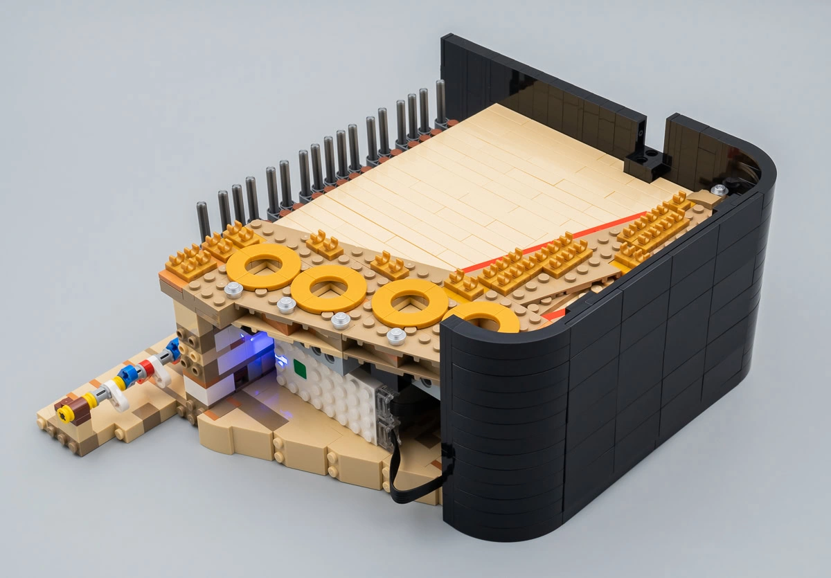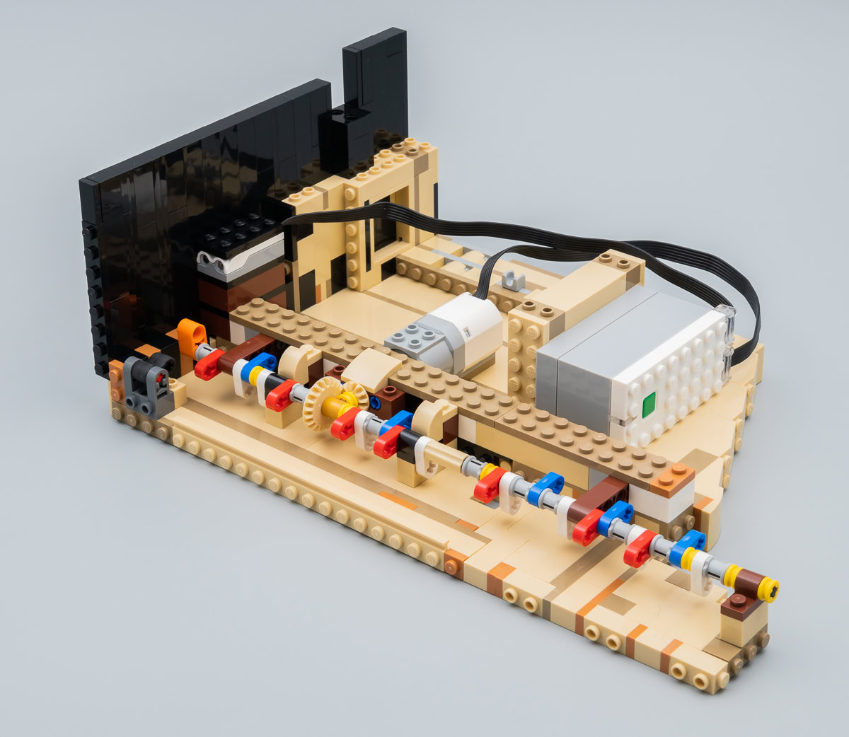 Dès le départ on installe les trois éléments de l'écosystème Powered Up, le Smart Hub, le moteur et le capteur, qui donneront vie à ce piano en mettant notamment en mouvement l'arbre à came qui fera bouger les touches lors de la lecture automatique d'une piste musicale. L'accès au Smart Hub se fait via une porte placée sur le côté de la caisse du piano qui permet d'allumer ou d'éteindre l'élément et de le retirer pour changer les piles sans avoir à démonter quoi que ce soit.