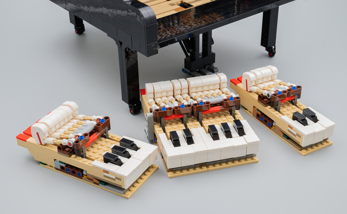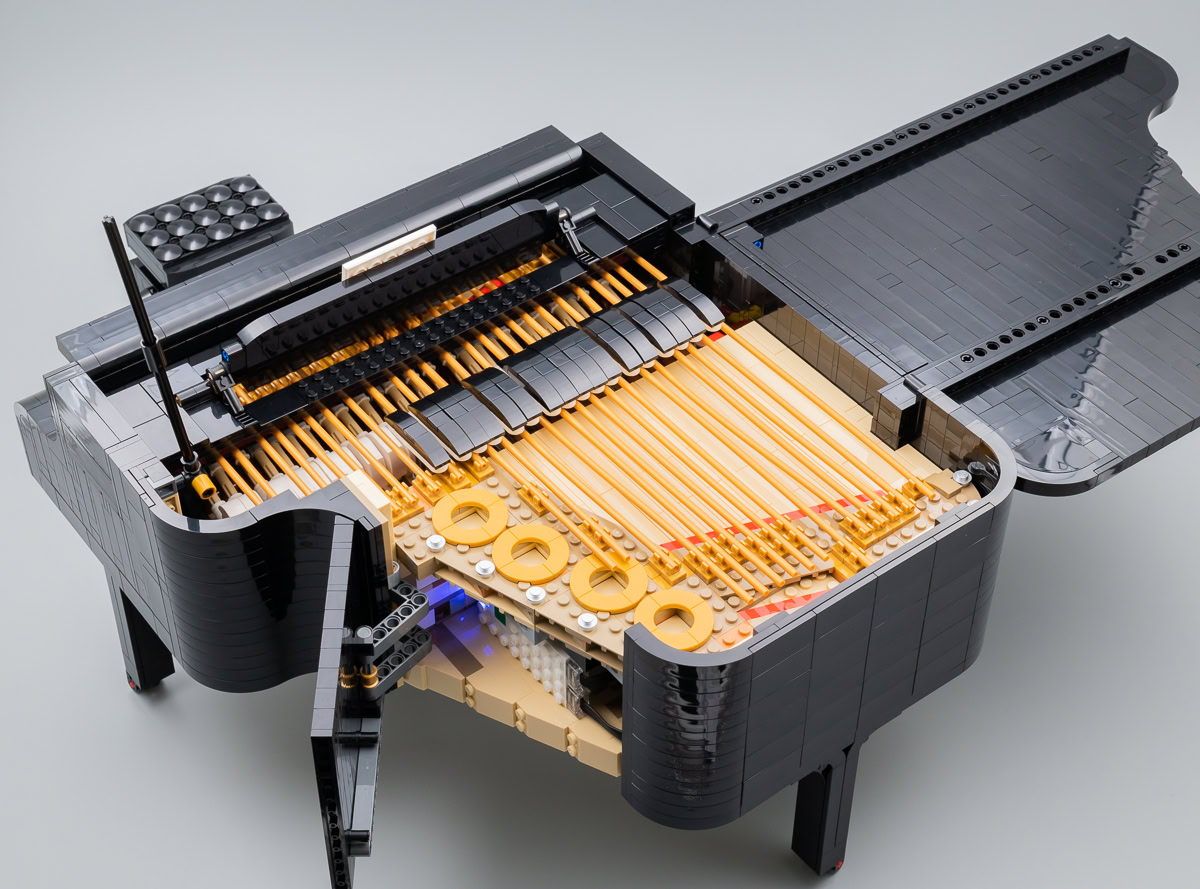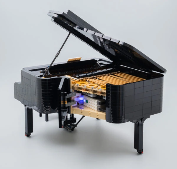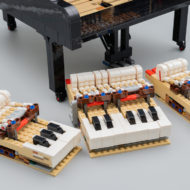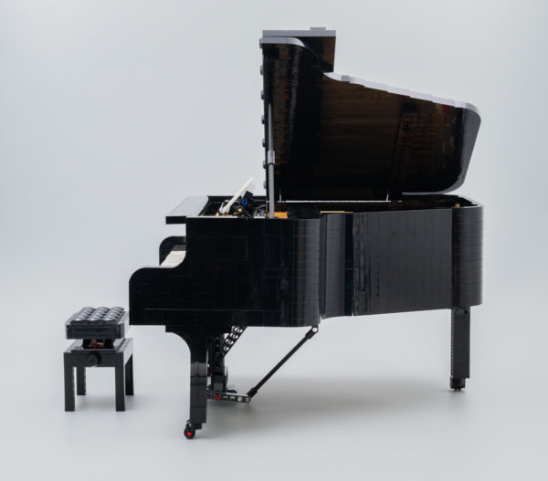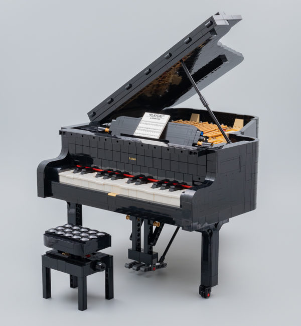 Visuellement, rien à dire, c'est très réussi et on obtient un joli piano à queue un peu plus compact et à la caisse un peu plus haute que sur une "vraie" version de l'instrument, mais tout y est avec la possibilité de le présenter ouvert ou fermé et de laisser la clavier apparent ou pas. On regrettera juste les quelques pins rouges qui restent visibles au niveau des pédales et des pieds, LEGO ayant manifestement du mal à uniformiser l'apparence de certains produits sans insister sur le côté "jouet de construction".