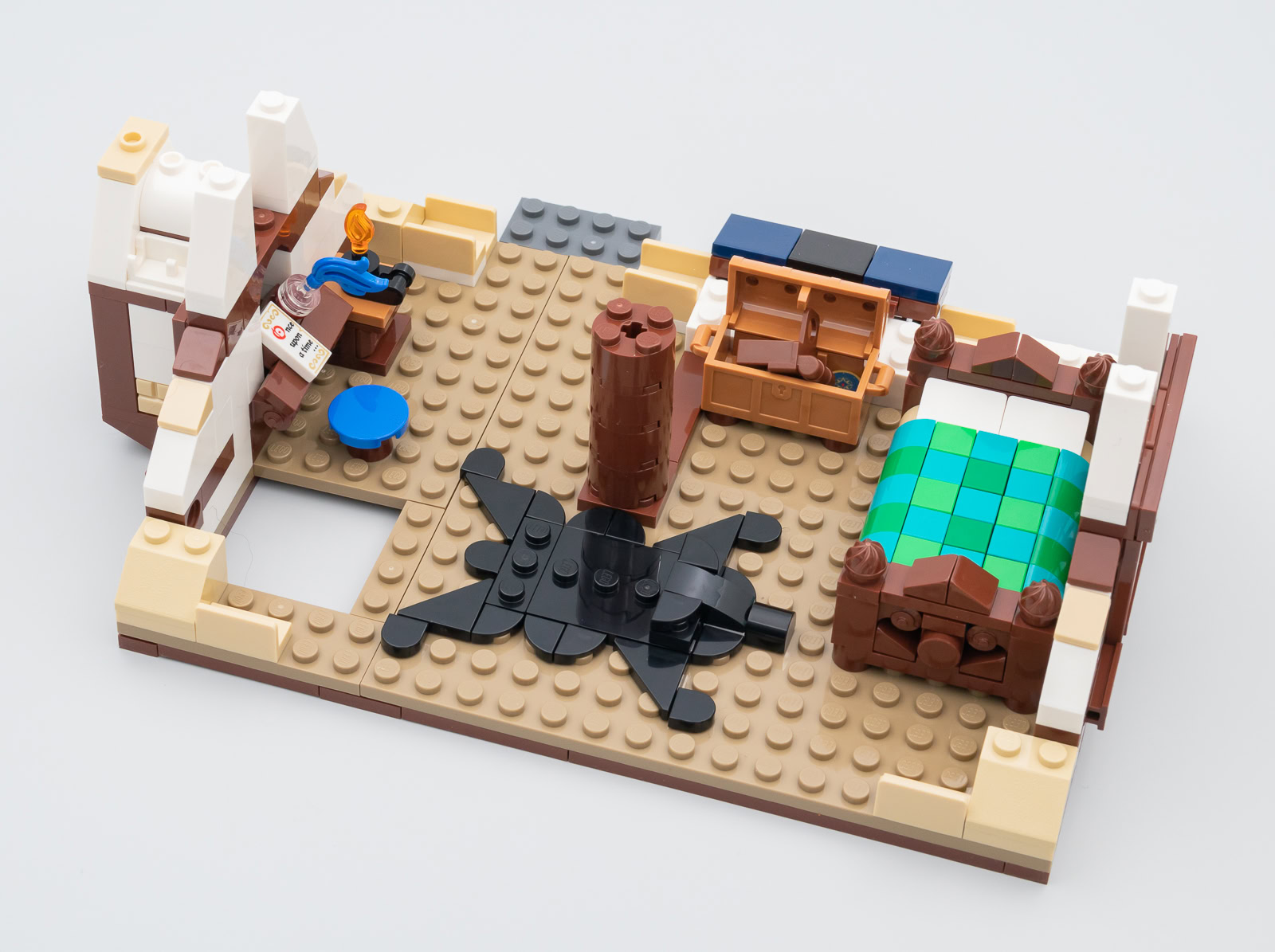 Pas de plaques de base dans cette boite, les différents niveaux de la maison à colombages reposent sur trois plaques 16x16 Dark Tan sur lesquelles viennent se greffer quelques plaques plus petites. L'ensemble est modulaire avec la possibilité de retirer le grenier et le premier étage pour accéder aux espaces intérieurs. Les deux pans du toit sont indépendants et sont eux aussi amovibles pour permettre un accès au grenier.