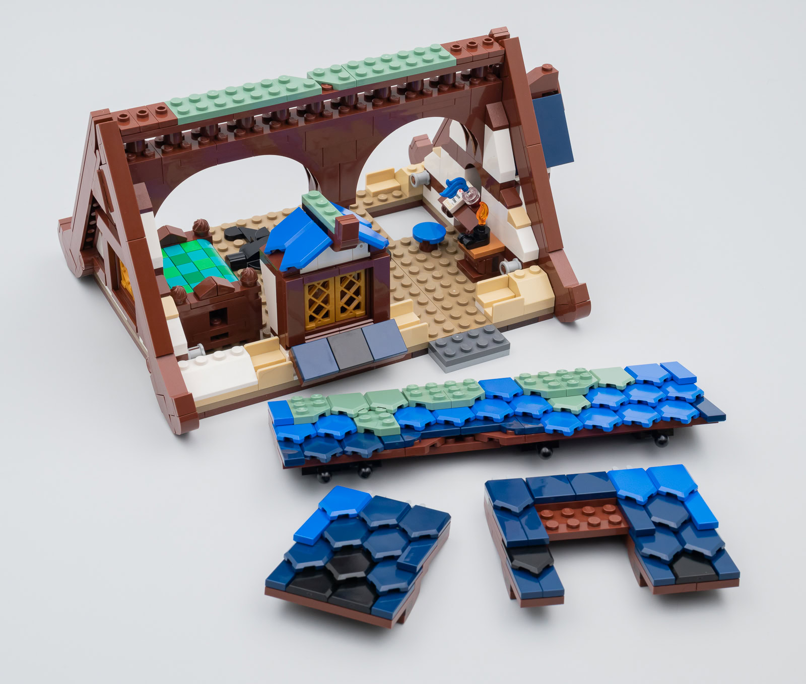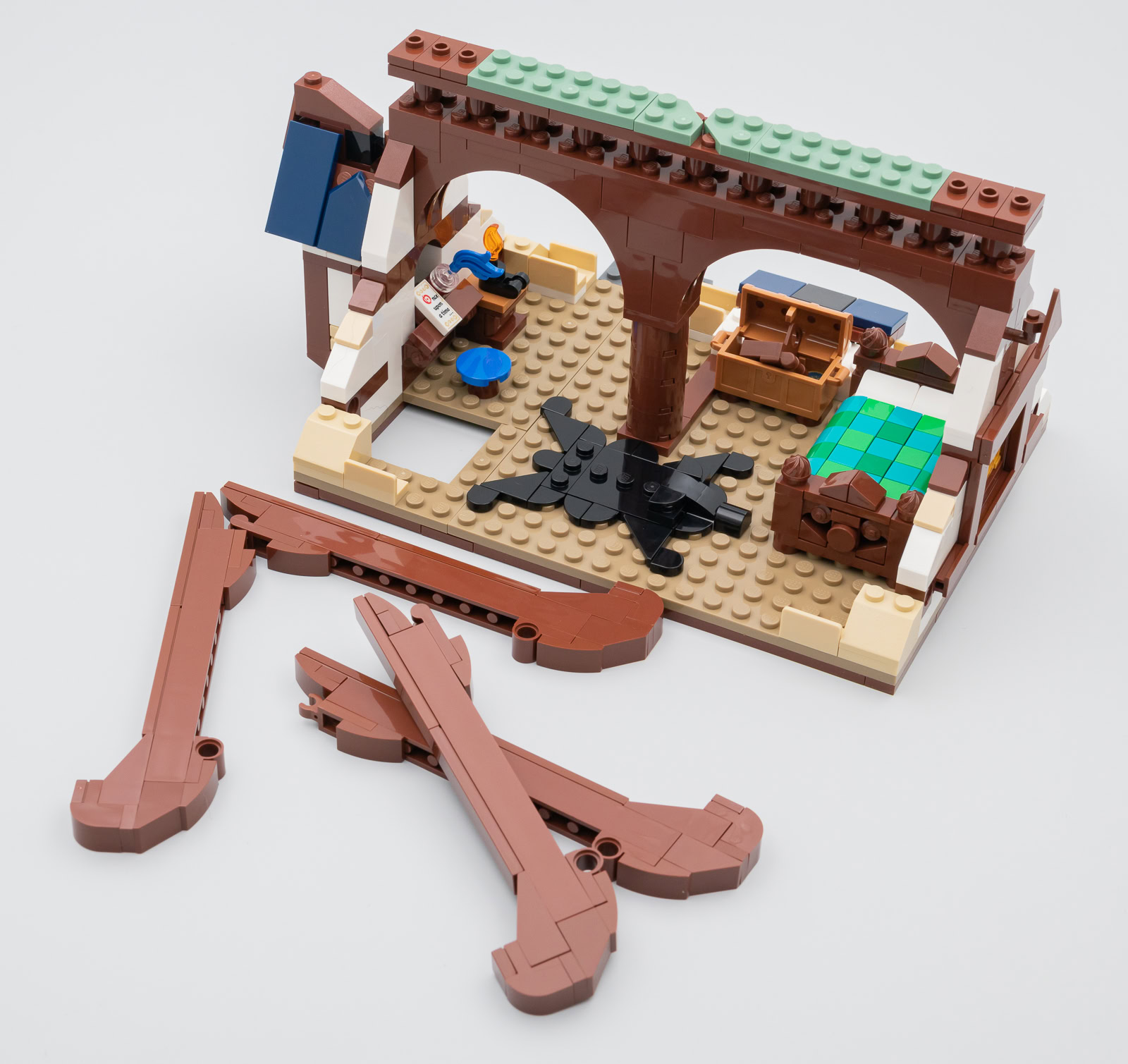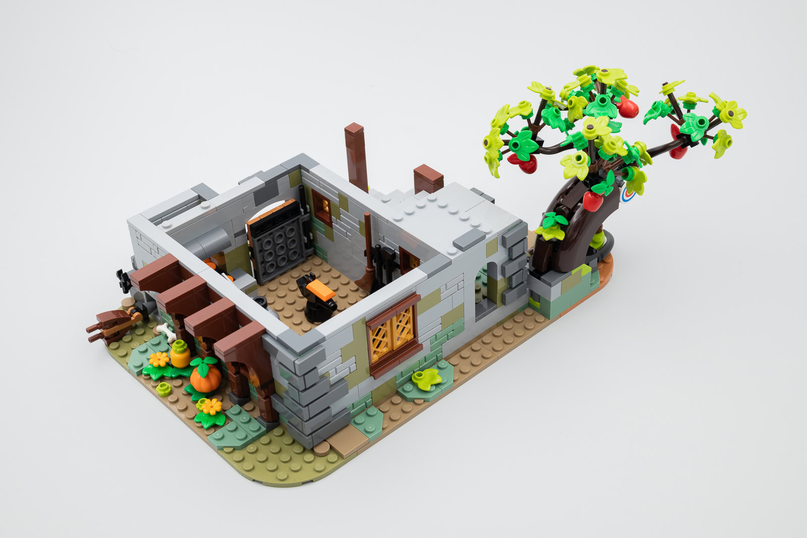 On pourrait discuter du côté flashy du toit avec ses écailles en trois teintes et son rendu un peu "cartoon". C'est plus propre que le toit de la bâtisse du projet LEGO IDEAS qui a servi de référence, certains trouveront sans doute que c'est un peu trop lisse et bien ordonné pour être crédible. Même constat pour l'arbre planté au dessus du puits, on assemble ici un arbre un peu plus stylisé et aux faux airs de bonsaï géant là ou celui du projet original était plus classique.