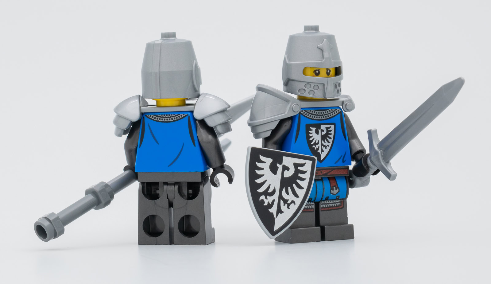 La parité est respectée pour les deux chevaliers qui utilisent le même torse et les mêmes jambes : un personnage masculin au visage courant dans la gamme CITY et qui réutilise la chevelure de Chief Wheeler (60246 Police Station) et un personnage féminin qui réutilise la tête de Jessica Sharpe vue dans le set LEGO CITY 60264 Ocean Exploration Submarine et la chevelure du zombie de la série 14. Les tampographies sont irréprochables et LEGO fournit une chevelure pour chacune des minifigs en plus du casque, histoire de varier les présentations ou les mises en scène.