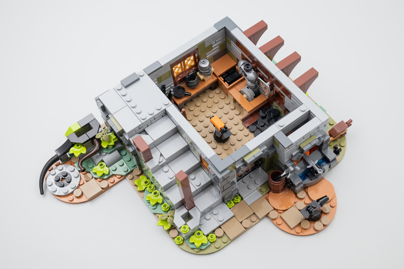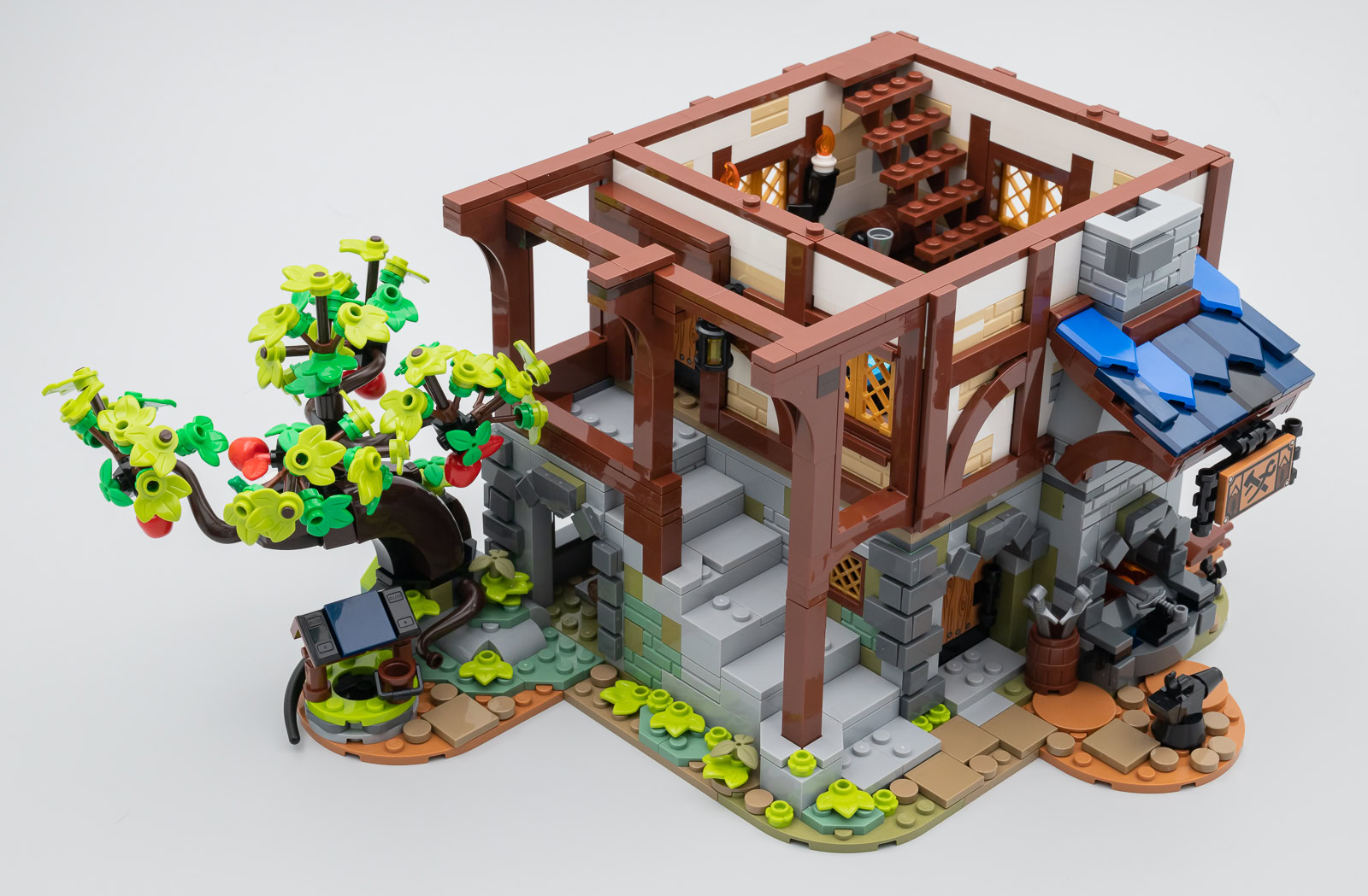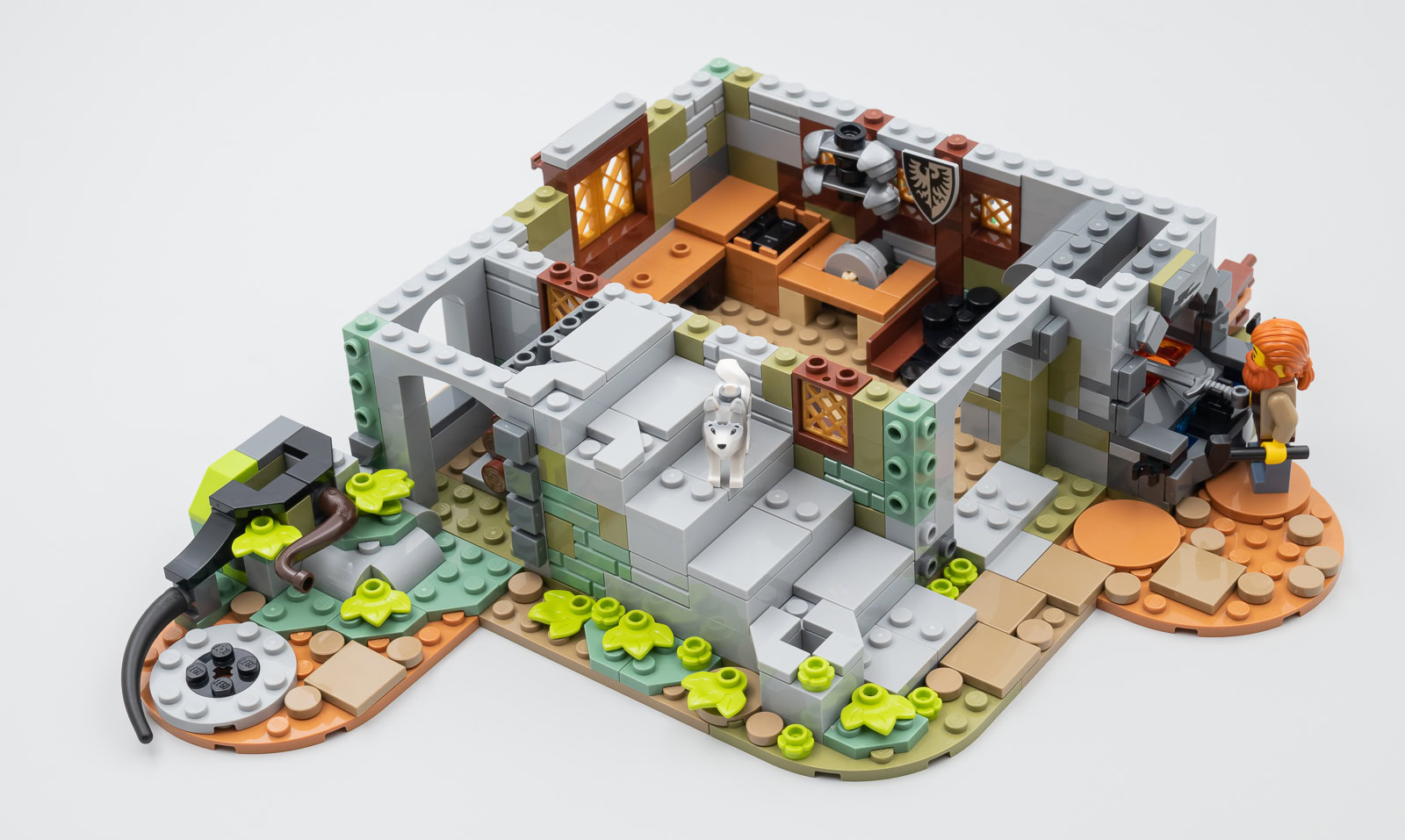 La maison du forgeron a perdu un peu en volume pendant la phase de conversion de la création originale en produit officiel de la gamme LEGO IDEAS et on obtient ici une construction (socle compris) de 27 cm de long, 21 cm de large et 27 cm de haut. Tant mieux pour ceux qui lui chercheront une place sur une étagère, tant pis pour ceux qui imaginaient cette construction comme l'imposant point central d'un diorama médiéval.