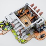 Il n'y a rien à dire sur l'aménagement des différents espaces, c'est vraiment très riche en meubles et en accessoires divers et variés et c'est du niveau des meilleurs Modulars classiques avec quelques jolies techniques. Le sol reste en tenons apparents, j'aurais aimé un plancher pour le premier étage et le grenier. La forge est équipée d'une brique lumineuse qu'on active en poussant sur le soufflet enfiché sur le bouton. C'est original et bien dans l'esprit du set même si il est comme d'habitude impossible de laisser la brique allumée. On sait que c'est là, on s'amusera à pousser sur le soufflet de temps en temps.