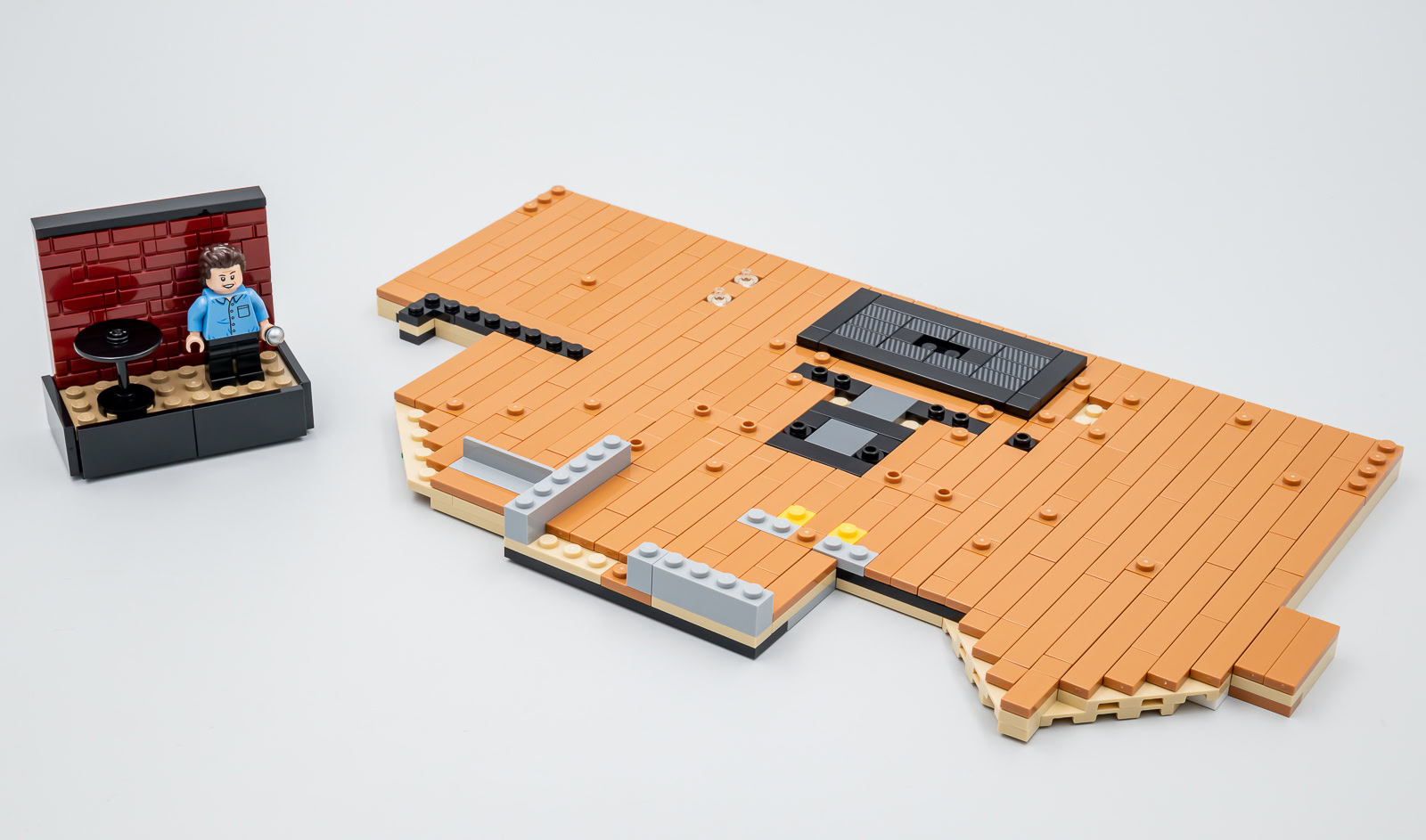 Premier détail de finition qui saute aux yeux : le sol de l'appartement est entièrement recouvert de Tiles qui forment un joli plancher. Le designer qui a repris le projet en main s'est assuré de laisser des tenons disponibles pour installer les meubles et positionner quelques minifigs dans les lieux et l'effet est franchement réussi. Le set 10292 F⋅R⋅I⋅E⋅N⋅D⋅S Apartments avec son sol tout en tenons apparents semble du coup vraiment manquer de finition à côté du travail esthétique simple mais efficace réalisé ici.