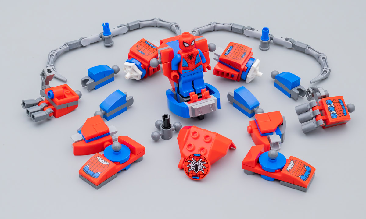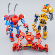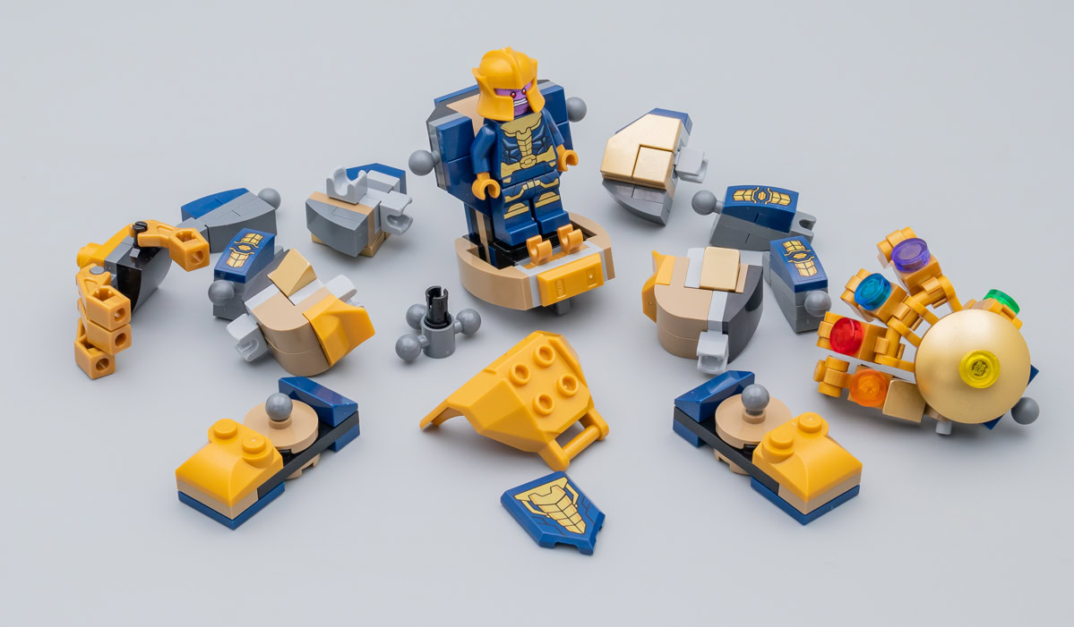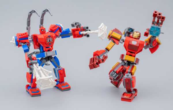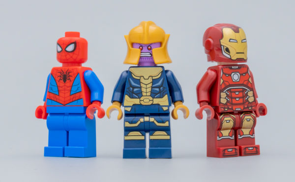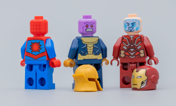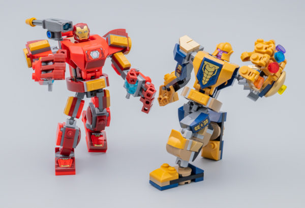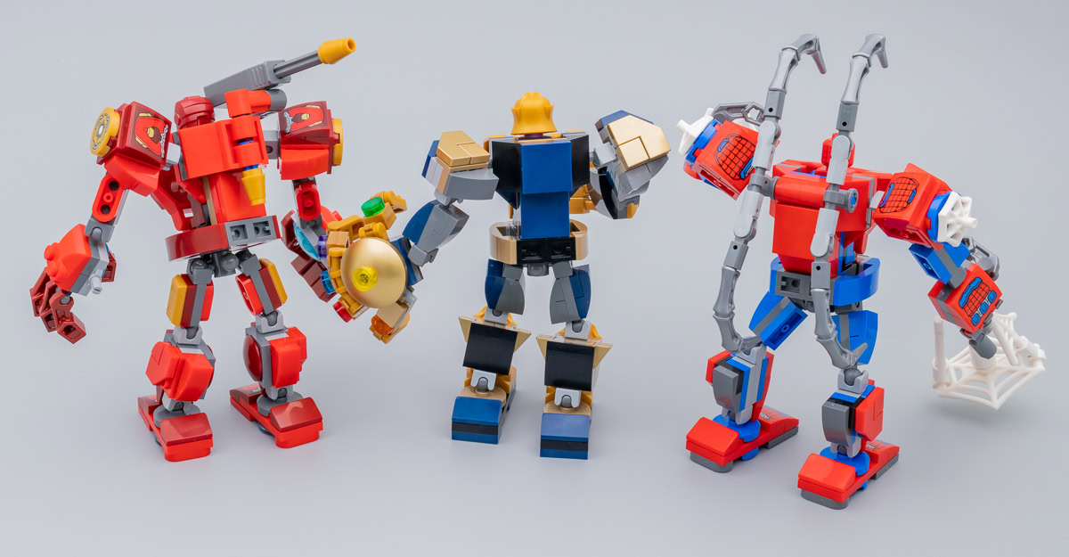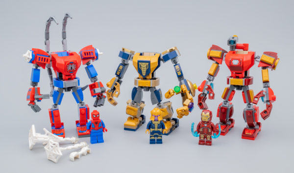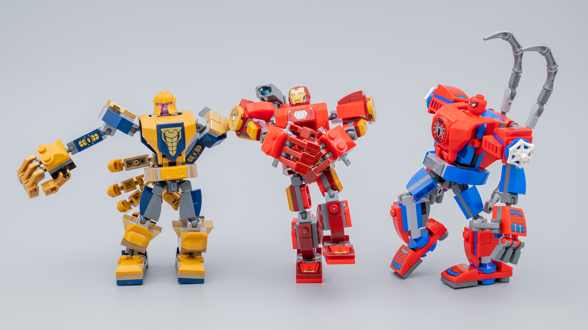 Chacun de ces mechs a donc ses particularités qui le rendent immédiatement identifiable et l'associent au personnage qui doit prendre place dans le poste de pilotage : Spider-Man peut lancer de la toile grâce au pin Technic placé au creux de chacune des mains qui permet d'enficher les éléments qu'on retrouve généralement entre les mains de la minifig du personnage, Iron-Man dispose de répulseurs sous les pieds et au creux de ses mains et d'un lance-missiles placé derrière l'épaule droite et Thanos est évidemment équipé de son gant sur lequel on retrouve les six Pierres d'infinité.