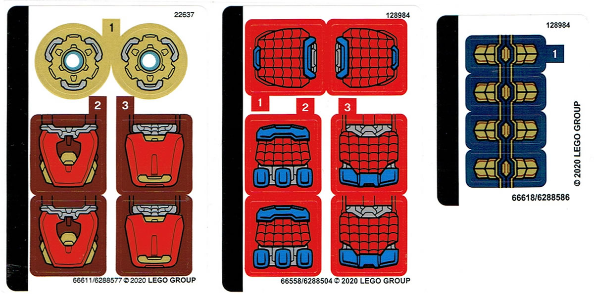 Il y a bien quelques stickers à coller ici sur les différents éléments d'armure et c'est le mech de Thanos qui utilise le moins d'autocollants. Pour chacun des mechs, les pièces fixées sur le torse sont tampographiées avec une araignée pour Spider-Man, un détail d'armure sur un bouclier Nexo Knights pour Thanos et un Arc Reactor pour Iron Man.