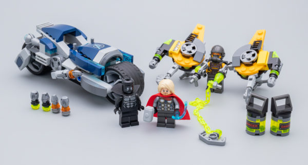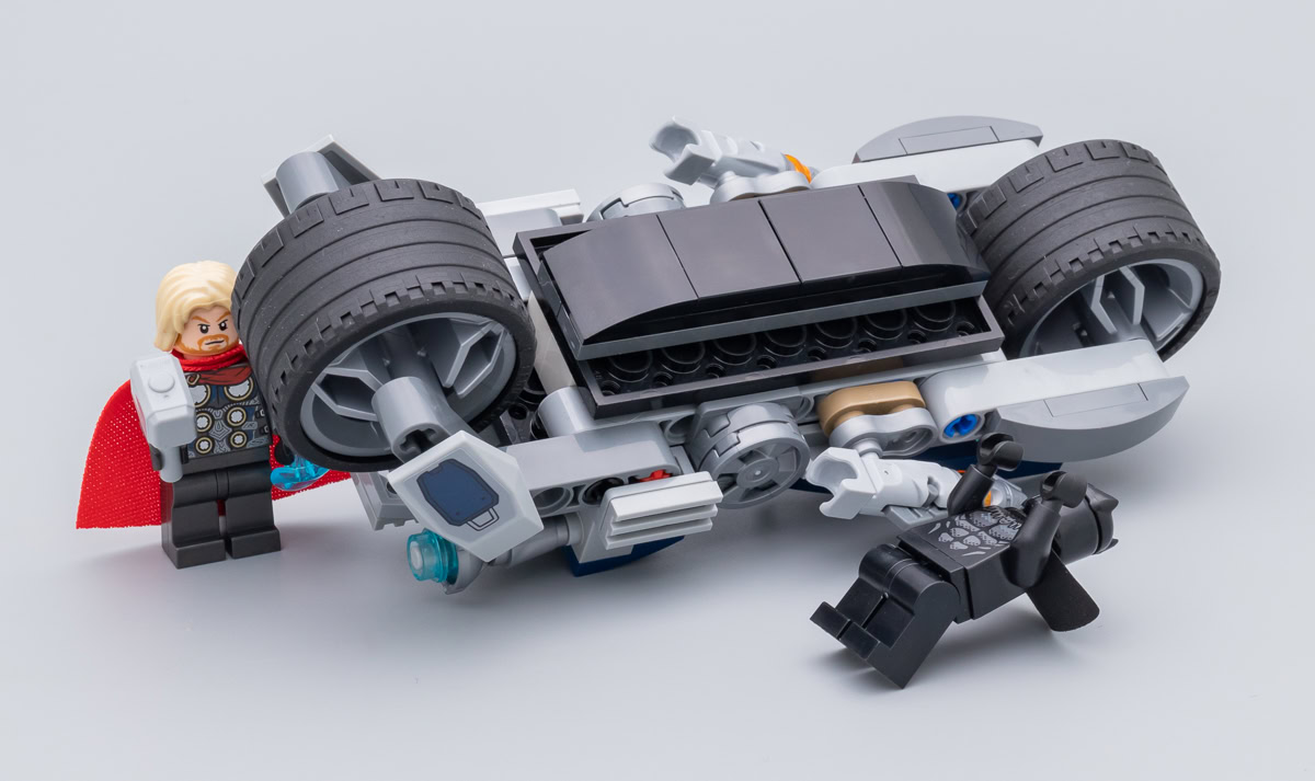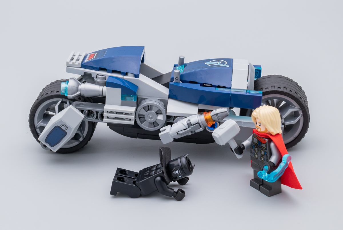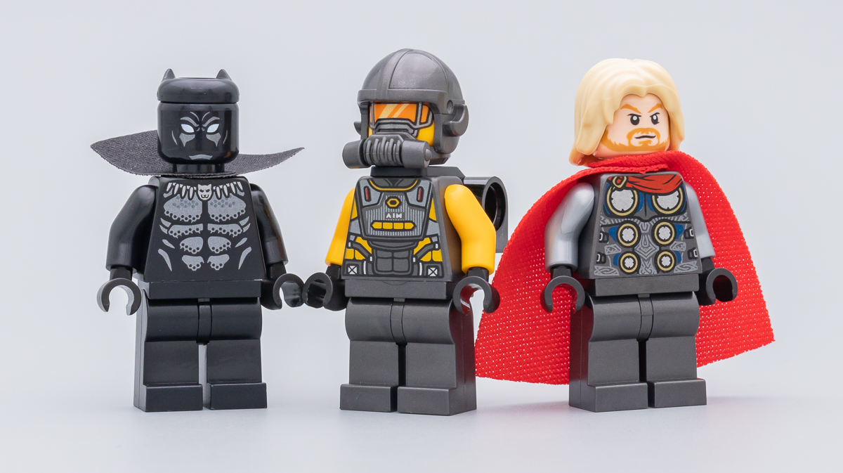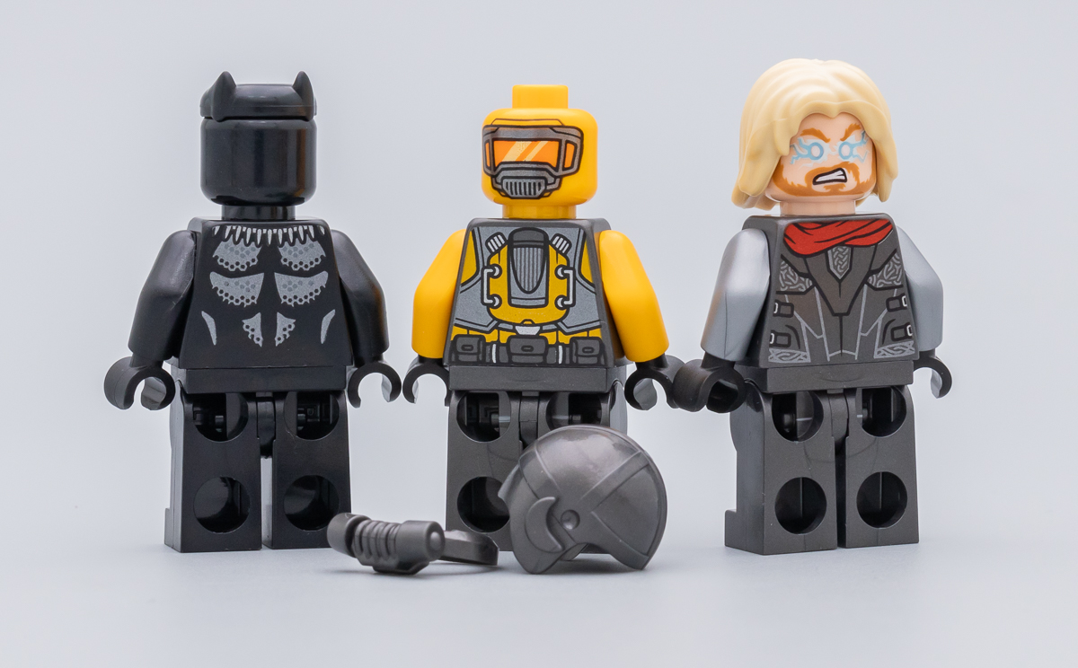 Les trois minifigs livrées ici sont inédites. Elles sont inspirées du jeu vidéo Marvel's Avengers et permettent donc de s'offrir des variantes originales de Thor et Black Panther. On retiendra aussi qu'aucune des trois minifigs livrées dans ce set ne bénéficie de jambes tampographiées. Il n'est pas toujours indispensable de surcharge une figurine en détails divers et variés pour la rendre crédible mais lorsque la totalité des personnages d'une boite fait l'impasse, on ne peut s'empêcher de penser que LEGO a voulu faire quelques économies.