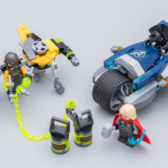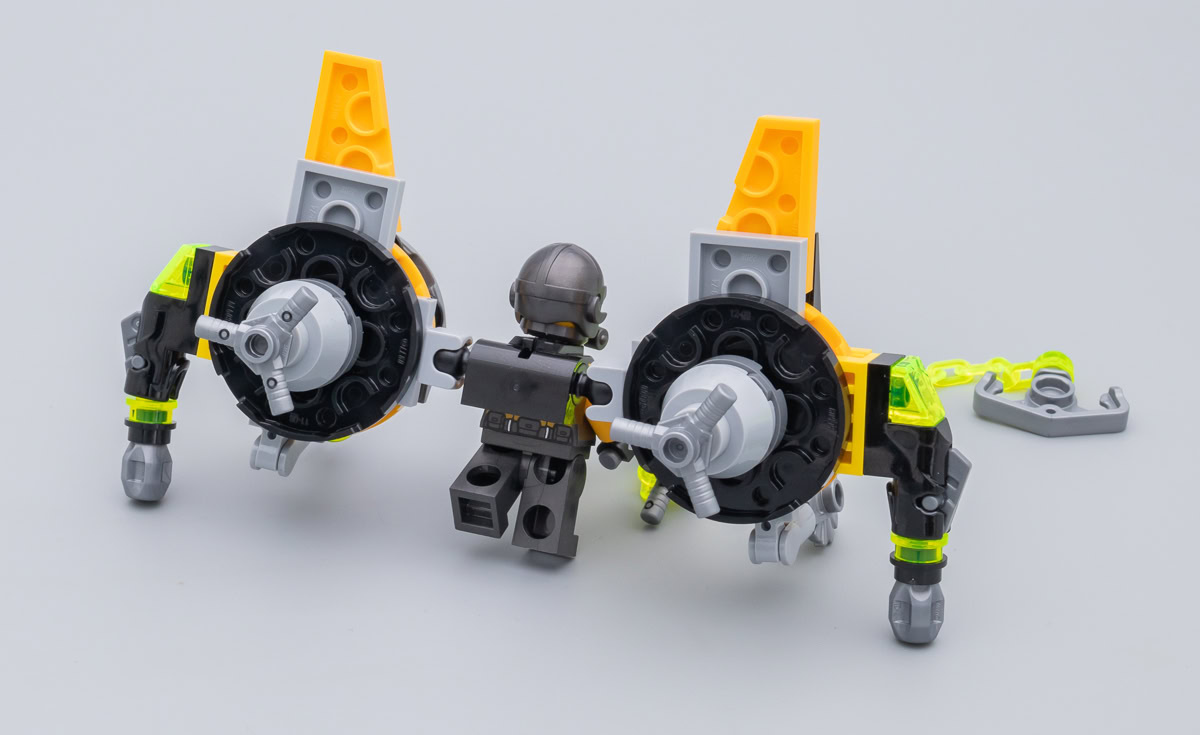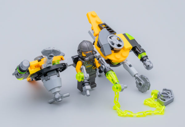 On retrouve ici tous les éléments des deux packs d'accessoires qui ne sont pas intégrés à la moto et c'est donc un peu chargé. On sent qu'il fallait tout caser et le designer a fait de son mieux. Deux bidons de produit dangereux (c'est écrit dessus) sont fournis et l'agent de l'A.I.M. peut les emporter grâce à l'ancre fixée au bout de la chaîne, elle-même fixée au bout d'un lance-grappin qui ne lance pas de grappin. L'ensemble minifig / jetpack est visuellement très cohérent grâce aux éléments de couleurs orange placés sur le carénage du jetpack et aux bras et à la tête de la minifig.