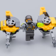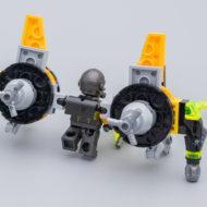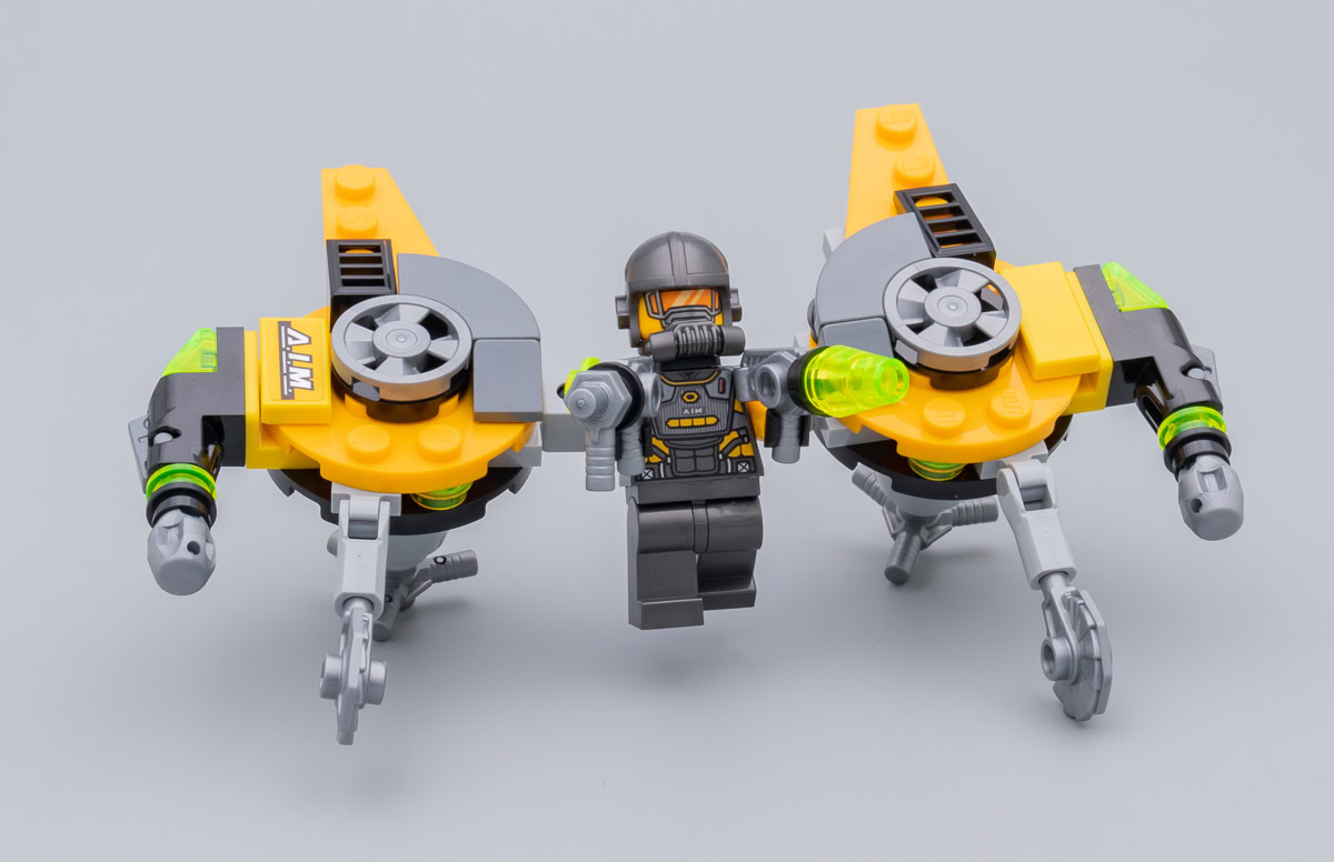 Le jetpack de l'agent de l'A.I.M. est plutôt réussi, il est constituées de deux parties mobiles et indépendantes fixées dans le dos de la minifig. J'aurais apprécié que les deux Stud-Shooters soient orientables et ne restent pas dans l'axe du support pour conserver la possibilité d'ajuster le tir sans toucher à la position de vol.