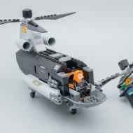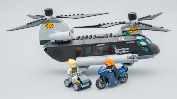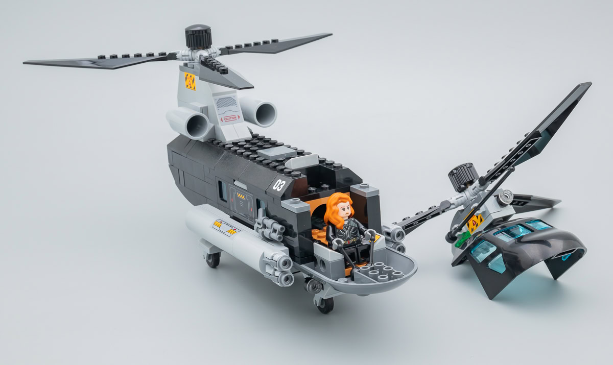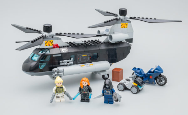 Dans la boite, on trouve donc de quoi assembler un hélicoptère Chinook, parce que deux rotors c'est mieux même si l'hélico du film n'est pas de ce modèle, qui devrait rappeler des souvenirs aux fans de la gamme LEGO CITY qui ont fait l'acquisition du set 60093 Deep Sea Helicopter commercialisé en 2015, une moto, un mini-quad et trois personnages : Black Widow (Natasha Romanoff), Yelena Belova et Taskmaster (Anthony Masters).