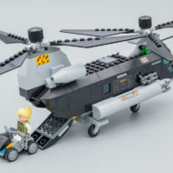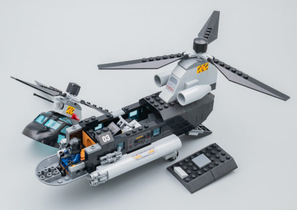 L'hélicoptère avec sa carlingue noire et son armement à base de Stud-Shooters est plutôt réussi et il offre suffisamment d'espace intérieur pour y ranger quelques minifigs ou le mini-quad. Ce dernier peut être logé dans l'hélicoptère en passant au choix par la trappe située à l'arrière ou en soulevant le toit de l'engin. Le poste de pilotage est accessible en enlevant la grosse verrière.