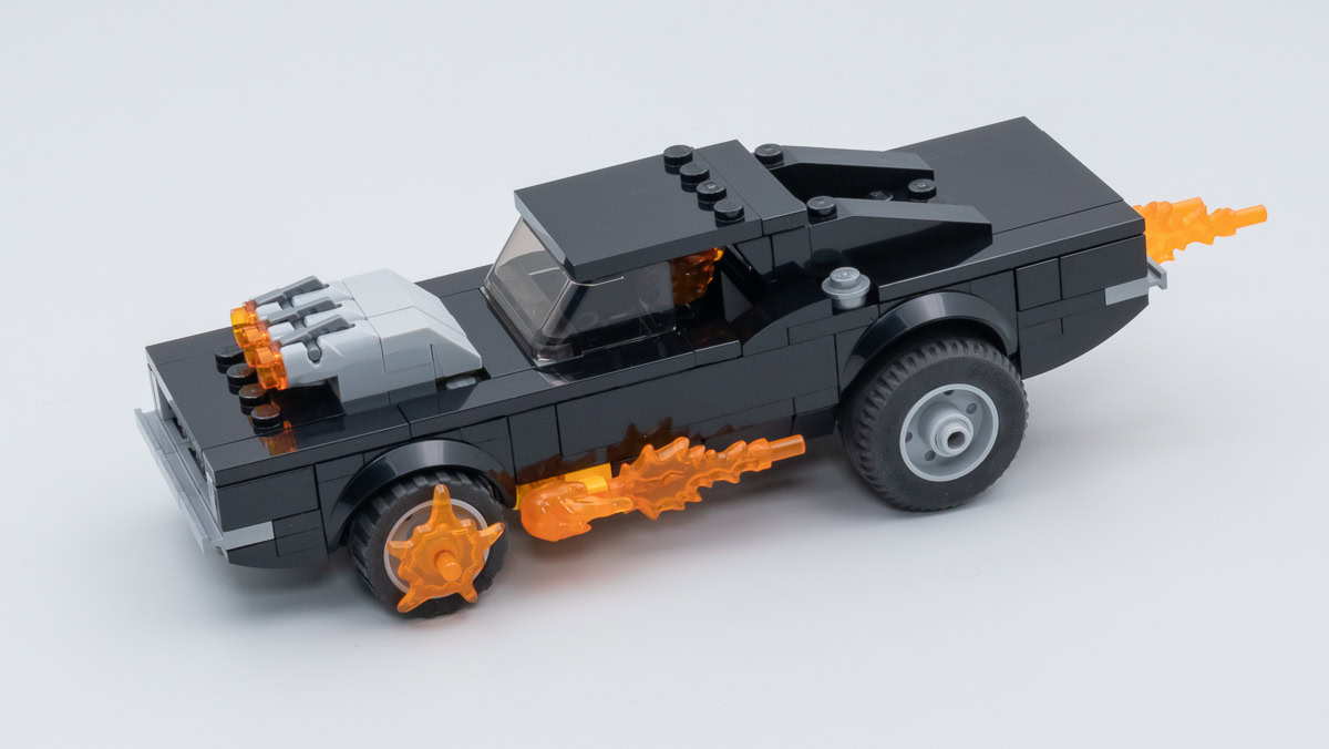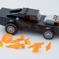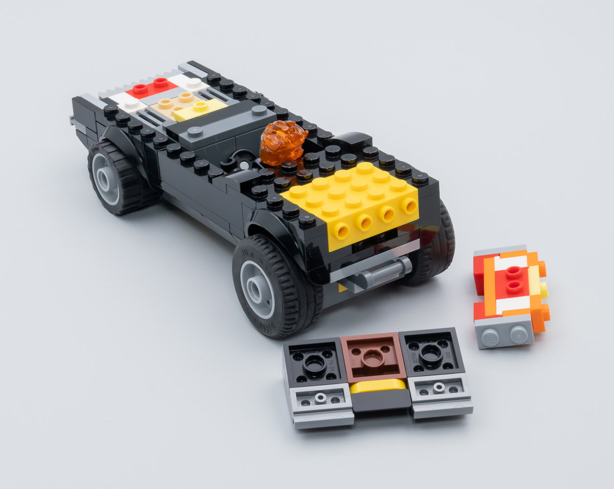En retirant quelques pièces de carrosserie pour libérer des points de connexion, Le véhicule de Robbie Reyes peut passer en mode Ghost Rider à l'aide d'un exemplaire du sachet d'éléments de couleur orange souvent fourni dans les sets de la gamme LEGO Marvel Super Heroes et l'effet obtenu est plutôt convaincant avec quelques touches enflammées qui ne dénaturent pas l'apparence globale de la voiture.